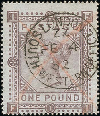 £1 brown-lilac, Plate 1, FI, cancelled by