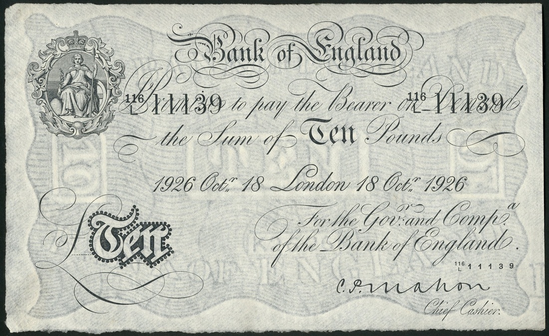 Bank of England, C.P. Mahon, £10, London, 18 October 1926, serial number 116/L 11139, black and white, ornate crowned vignette of Britannia top left, value in black tablet low left