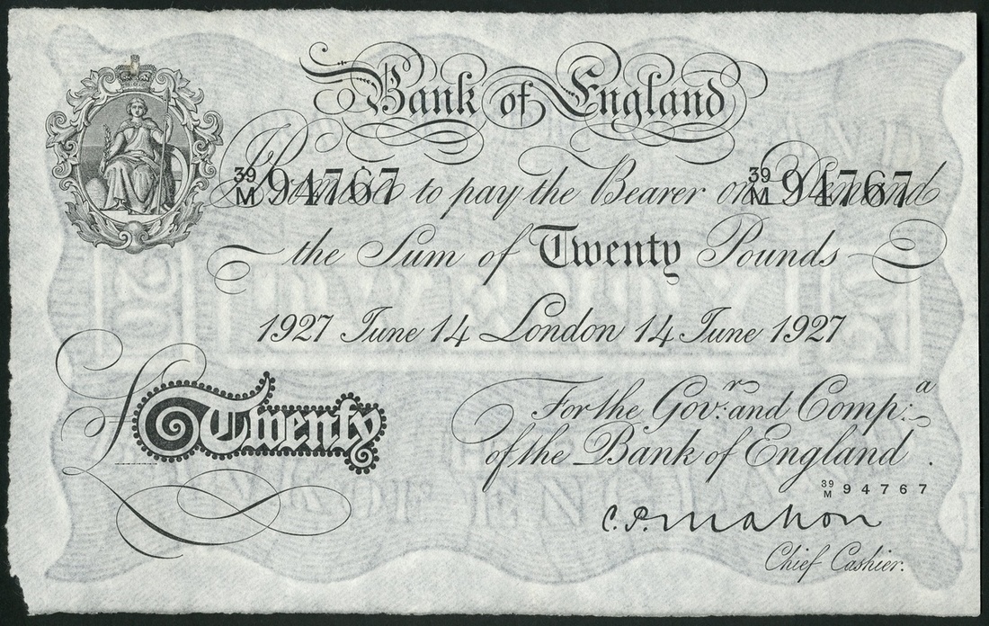 Bank of England, C.P. Mahon, £20, London, 14 June 1927, serial number 39/M 94767, black and white, ornate crowned vignette of Britannia top left, value in black tablet low left