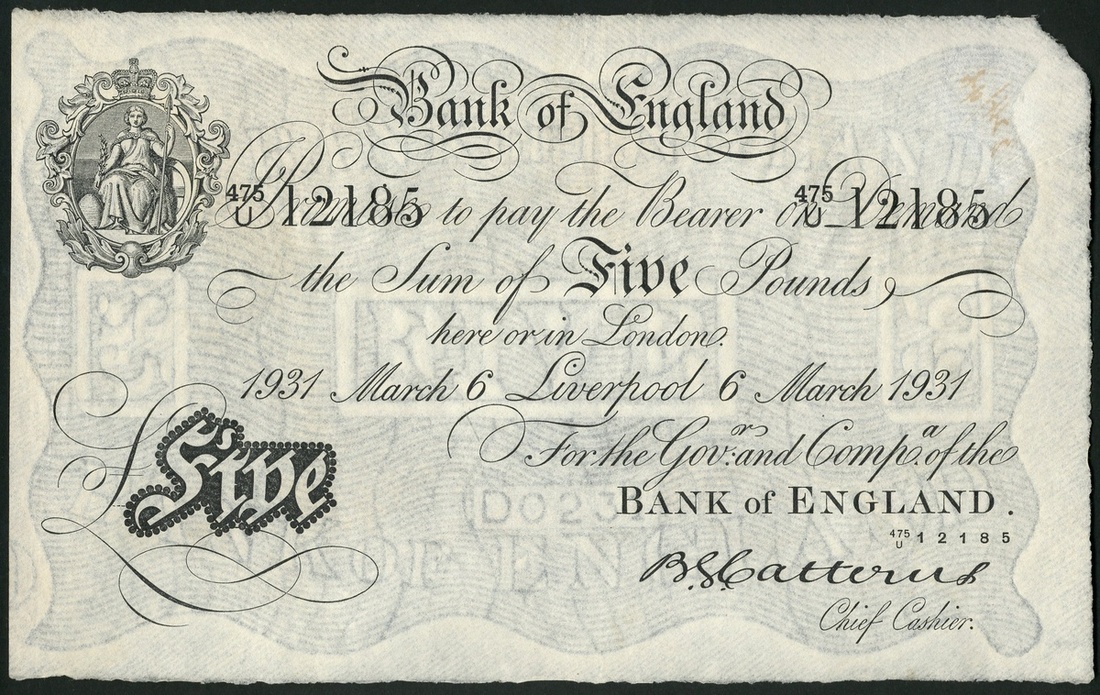 Bank of England, B.G. Catterns, £5, Liverpool, 6 March 1931, serial number 475/U 12185, black and white, ornate crowned vignette of Britannia top left, value in black tablet low left