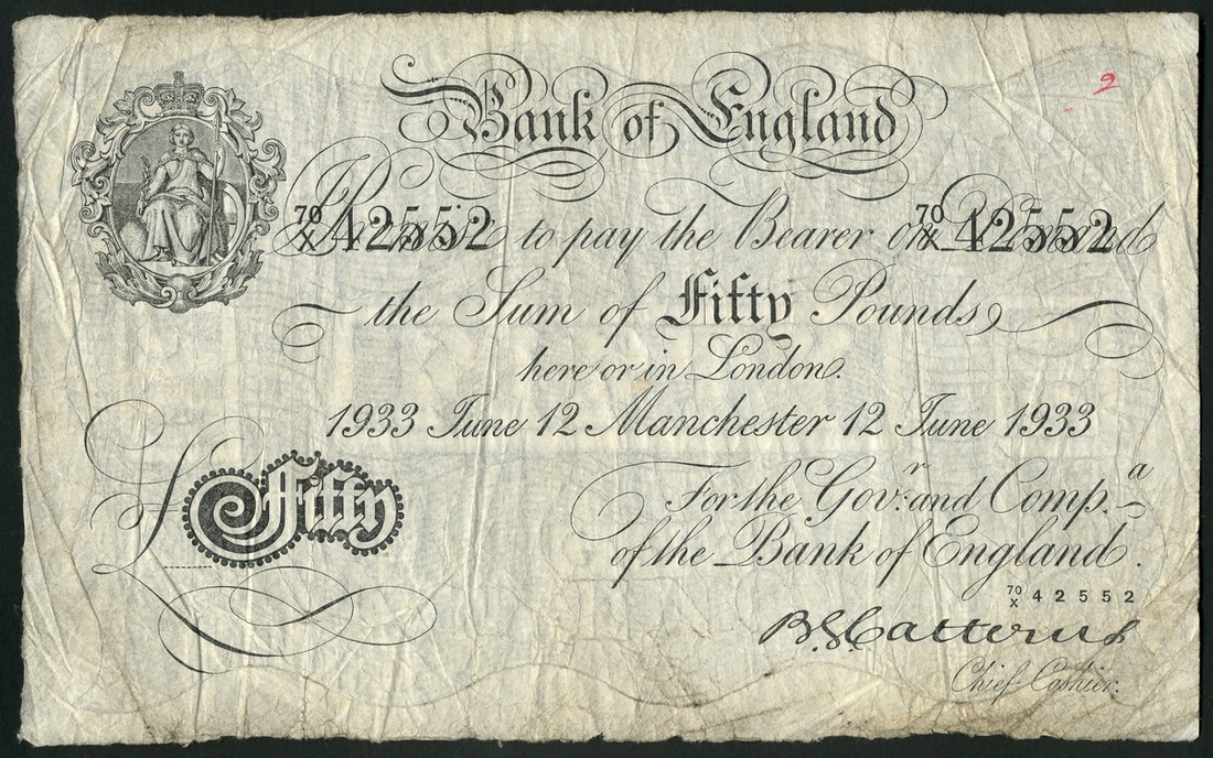 Bank of England, B.G. Catterns, £50, Manchester, 12 June 1933, serial number 70/X 42552, black and white, ornate crowned vignette of Britannia top left, value in black tablet low left