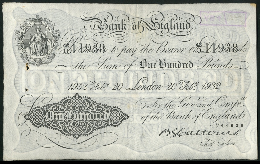 Bank of England, B.G. Catterns, £100, London, 20 February 1932, serial number 42/O 11938, black and white, ornate crowned vignette of Britannia top left, value in black tablet low left