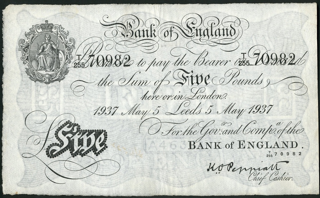 Bank of England, K.O. Peppiatt, £5, Leeds, 5 May 1937, serial number T/255 70982, black and white, ornate crowned vignette of Britannia top left, value in black tablet low left