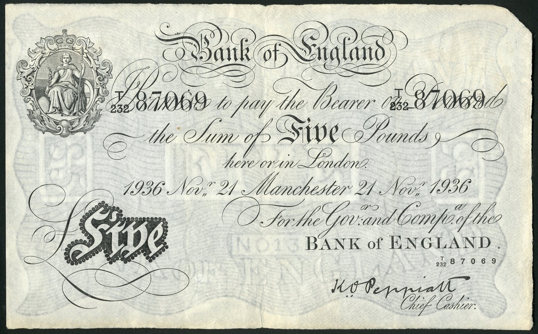 Bank of England, K.O. Peppiatt, £5, Manchester, 21 November 1936, serial number T/232 87069, black and white, ornate crowned vignette of Britannia top left, value in black tablet low left
