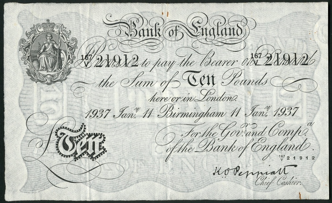 Bank of England, K.O. Peppiatt, £10, Birmingham, 11 January 1937, serial number 167/V 21912, black and white, ornate crowned vignette of Britannia top left, value in black tablet low left