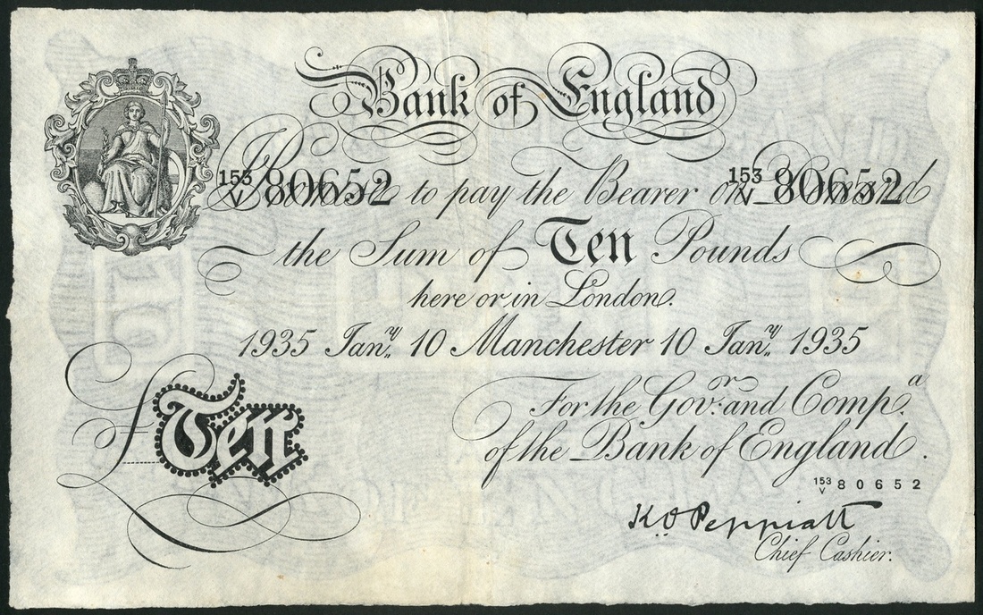 Bank of England, K.O. Peppiatt, £10, Manchester, 10 January 1935, serial number 153/V 80652, black and white, ornate crowned vignette of Britannia top left, value in black tablet low left
