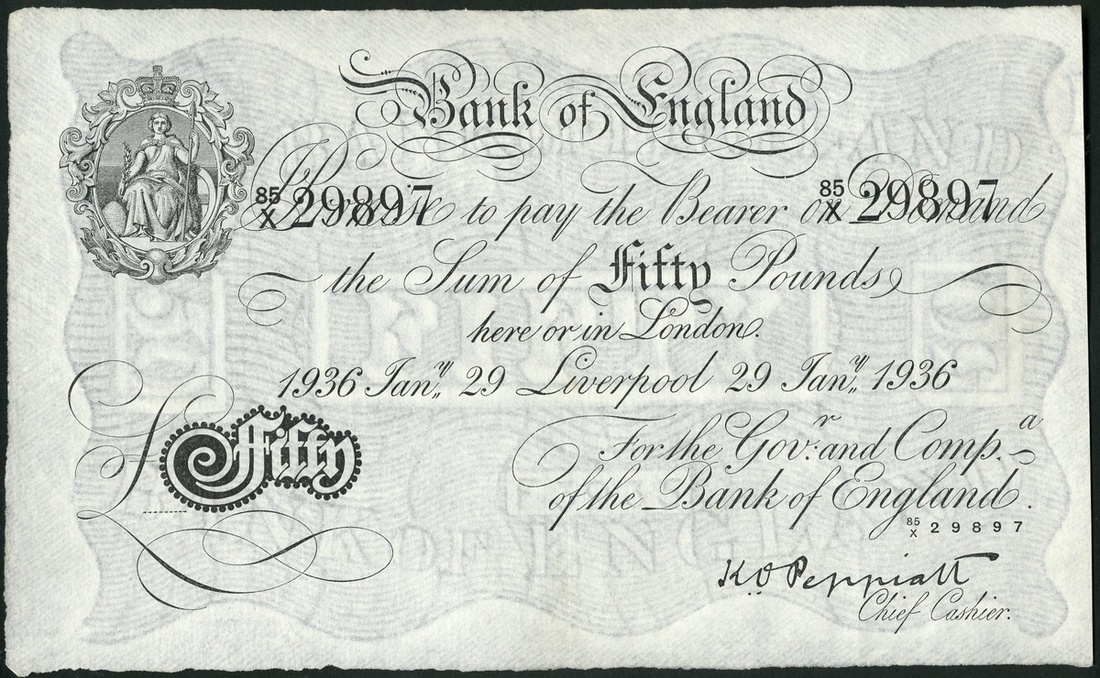 Bank of England, K.O. Peppiatt, £50, Liverpool, 29 January 1936, serial number 85/X 29897, black and white, ornate crowned vignette of Britannia top left, value in black tablet low left