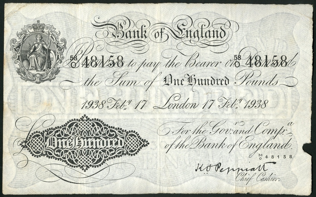 Bank of England, K.O. Peppiatt, £100, London, 17 February 1938, serial number 58/O 48158, black and white, ornate crowned vignette of Britannia top left, value in black tablet low left