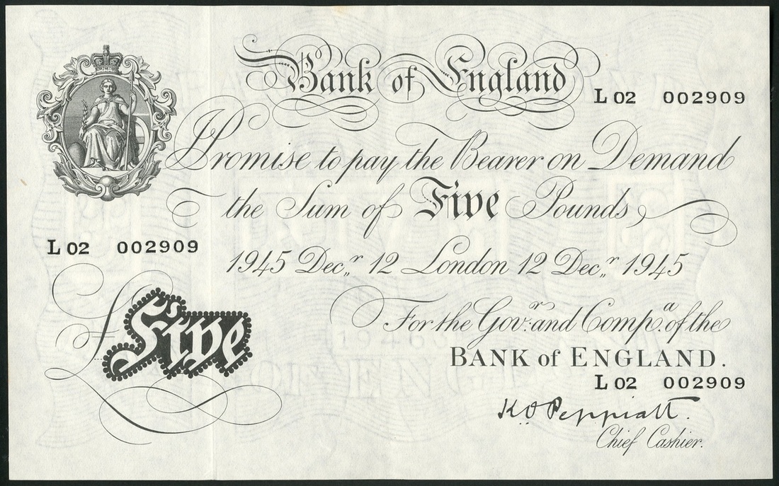 Bank of England, K.O. Peppiatt, £5, London, 12 December 1945, serial number L02 002909, black and white, ornate crowned vignette of Britannia top left, value in black tablet low left