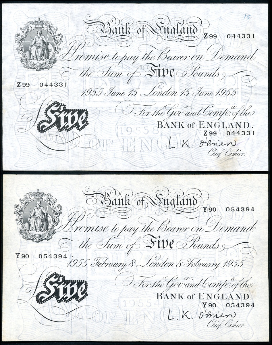 Bank of England, L.K. O'Brien, £5 (2), London, 1955, serial number prefixes Y90 and Z99, black and white, ornate crowned vignette of Britannia top left, value in black tablet low left