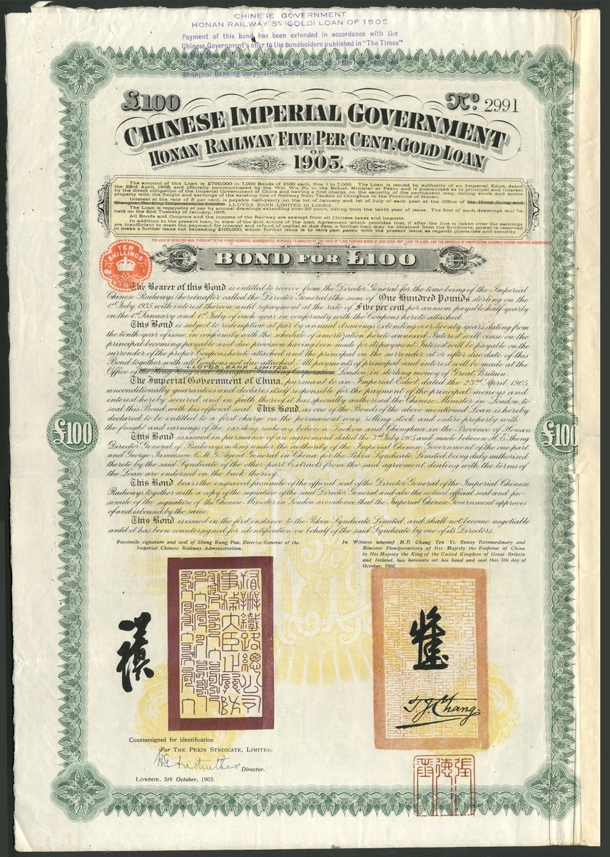 China: Chinese Imperial Government, 1905 Honan Railway 5% Gold Loan, bond for £100, first issue, dated 1905, #2991, ornate border, blue-green and black with yellow underprint, with coupons, red 'chop'. Nice clean GVF.