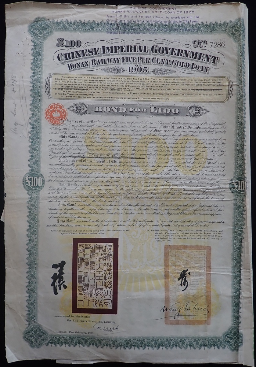 China: Chinese Imperial Government, 1905 Honan Railway 5% Gold Loan, bond for £100, second issue, dated 1906, #7286, ornate border, blue-green and black with yellow underprint, coupons glued at right edge, red 'chop'. Tear at top edge VF.