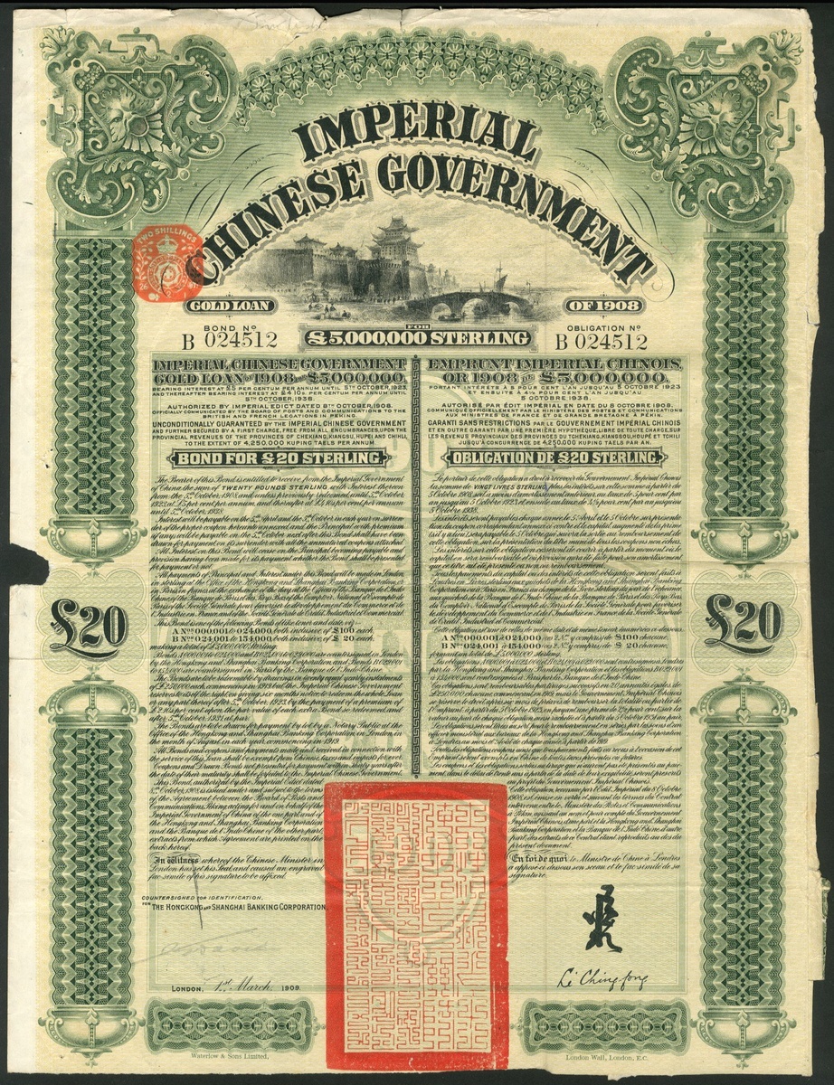 China: 1908 5% Gold Loan, Bond for £20 issued by the Hongkong and Shanghai Banking Corporation, #024512, walled city at top, green and black, red chop bottom centre, printed by Waterlow, no coupons remain as is usual. Small piece missing from left edge just missing the design, tear at top edge, F-VF and scarce issue.
