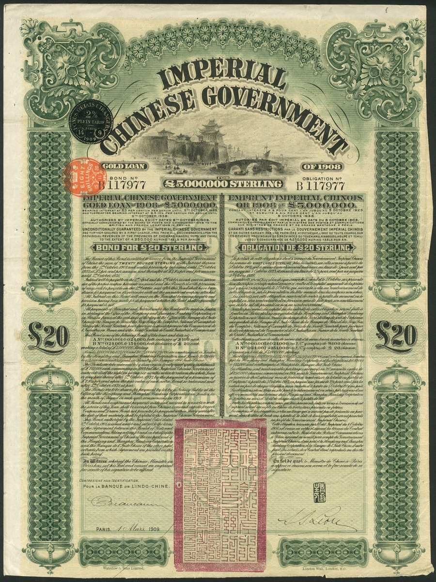 (x) China: 1908 5% Gold Loan, Bond for £20 issued by the Banque de L'Indo-Chine, #117977, walled city at top, green and black, red chop bottom centre, printed by Waterlow, no coupons remain as is usual. AVF.