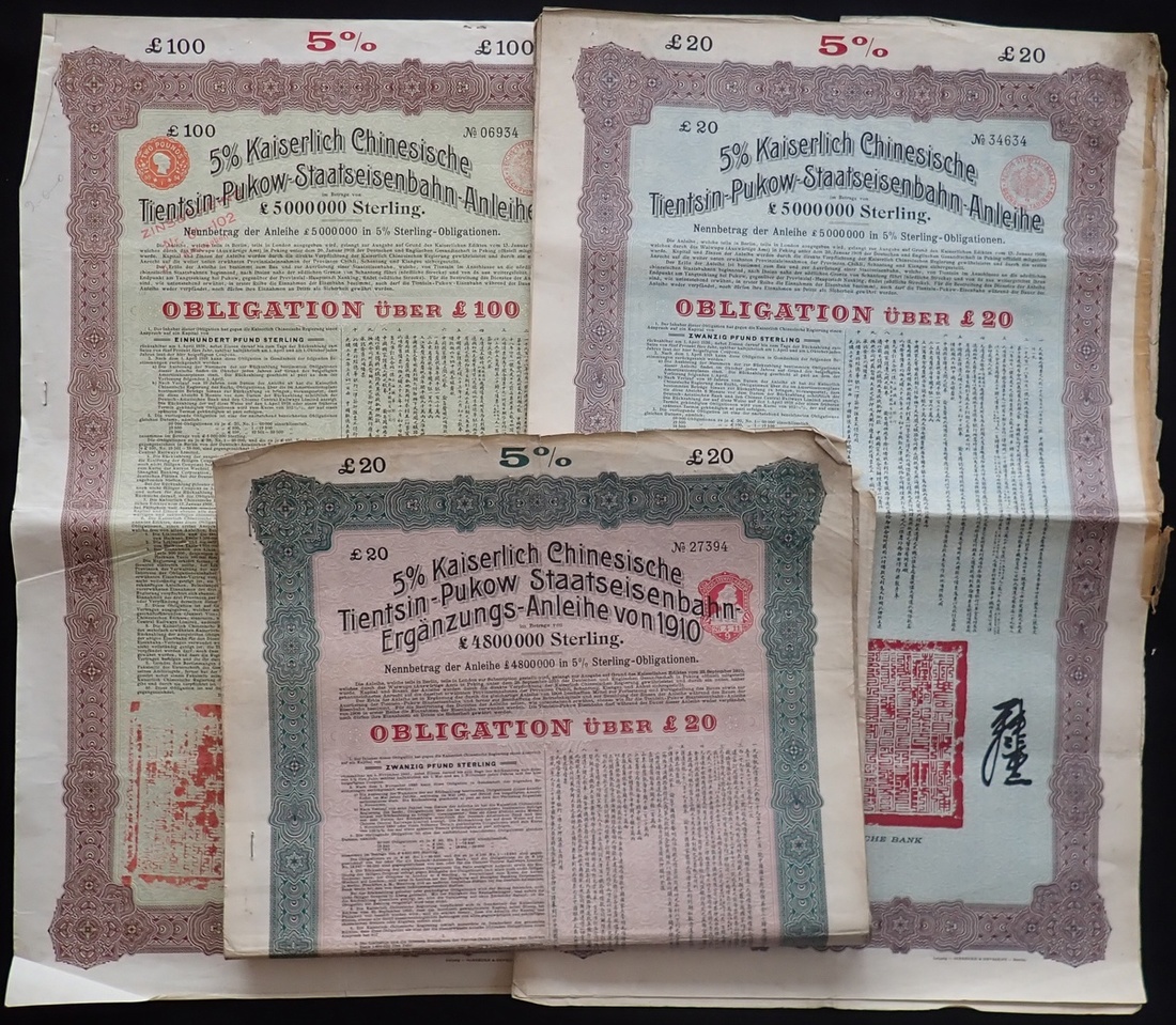 China: Tientsin Pukow Railway Loan, a group of bonds comprising 1908, £20, 4 exampes and £100, 1910, £20, 2 examples, all large format, multicoloured, with coupons. Mixed condition, generally VF (7).