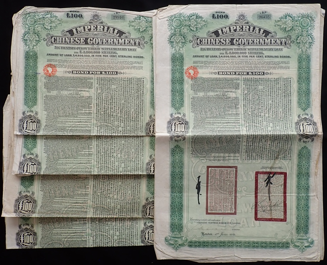 China: 1910 5% Tientsin-Pukow Railway Supplementary Loan, a group of 12 x £100 bonds, English issue, by Chinese Central Railways Ltd., large format, green, Waterlow printing, with coupons. Mixed condition, several with edge tears, F-VF (12).