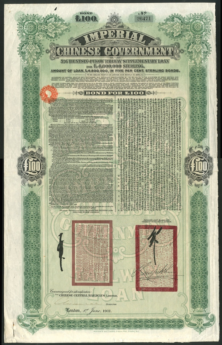 China: 1910 5% Tientsin-Pukow Railway Supplementary Loan, £100 bond, English issue, by Chinese Central Railways Ltd., #26471, large format, green, Waterlow printing, with coupons. Bottom edge a little trimmed, VF.