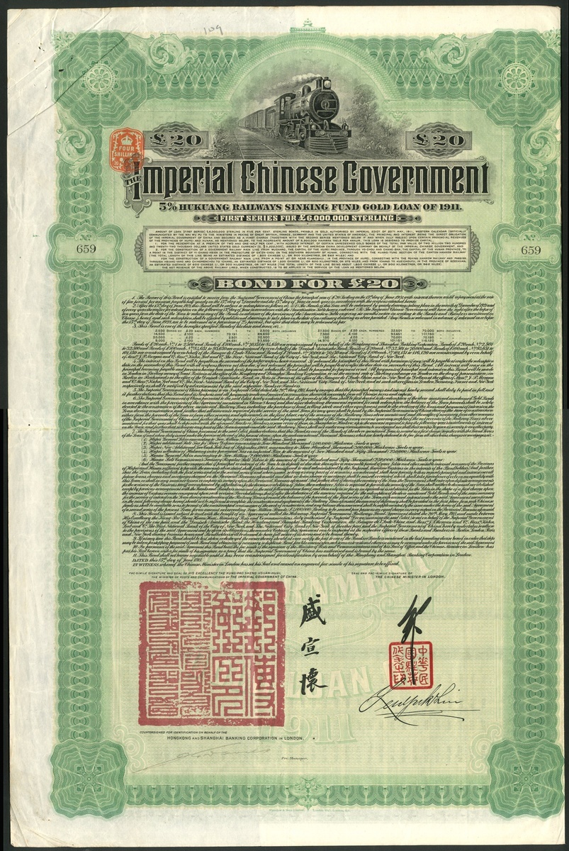 China: 1911, 5% Hukuang Railways 5% Gold Loan, a bond for £20, issued by the Hongkong and Shanghai Banking Corporation, #659, of only 2500 issued, large format, steam train at top, green and black, with coupons. VF.