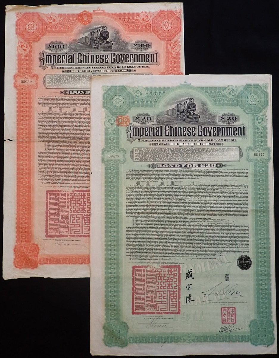 China: 1911, 5% Hukuang Railways 5% Gold Loan, a pair of bonds issued by the Banque de L'Indo-Chine, for £20, #69477 and £100, #95039, large format, steam train at top, green and red respectively, with coupons. VF and F (2).
