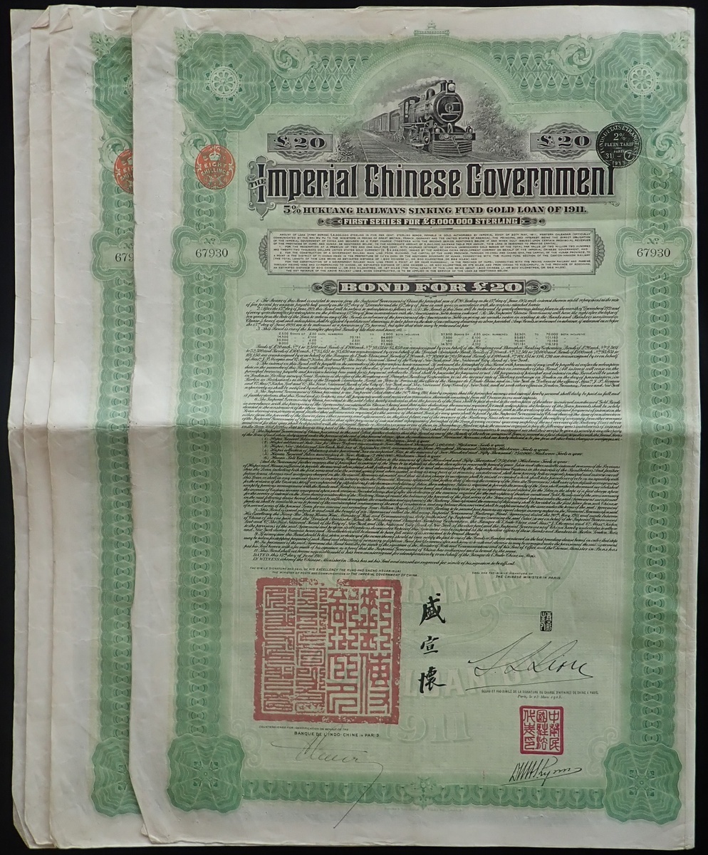 China: 1911, 5% Hukuang Railways 5% Gold Loan, a group of bonds for £20, issued by Banque de L'Indo-Chine, large format, steam train at top, green and black, with coupons. GVF (4).