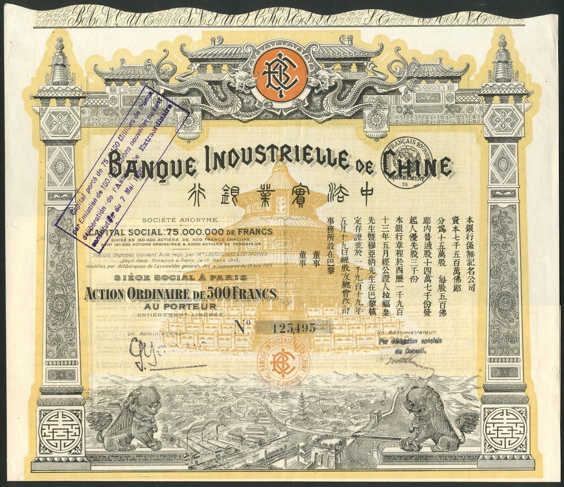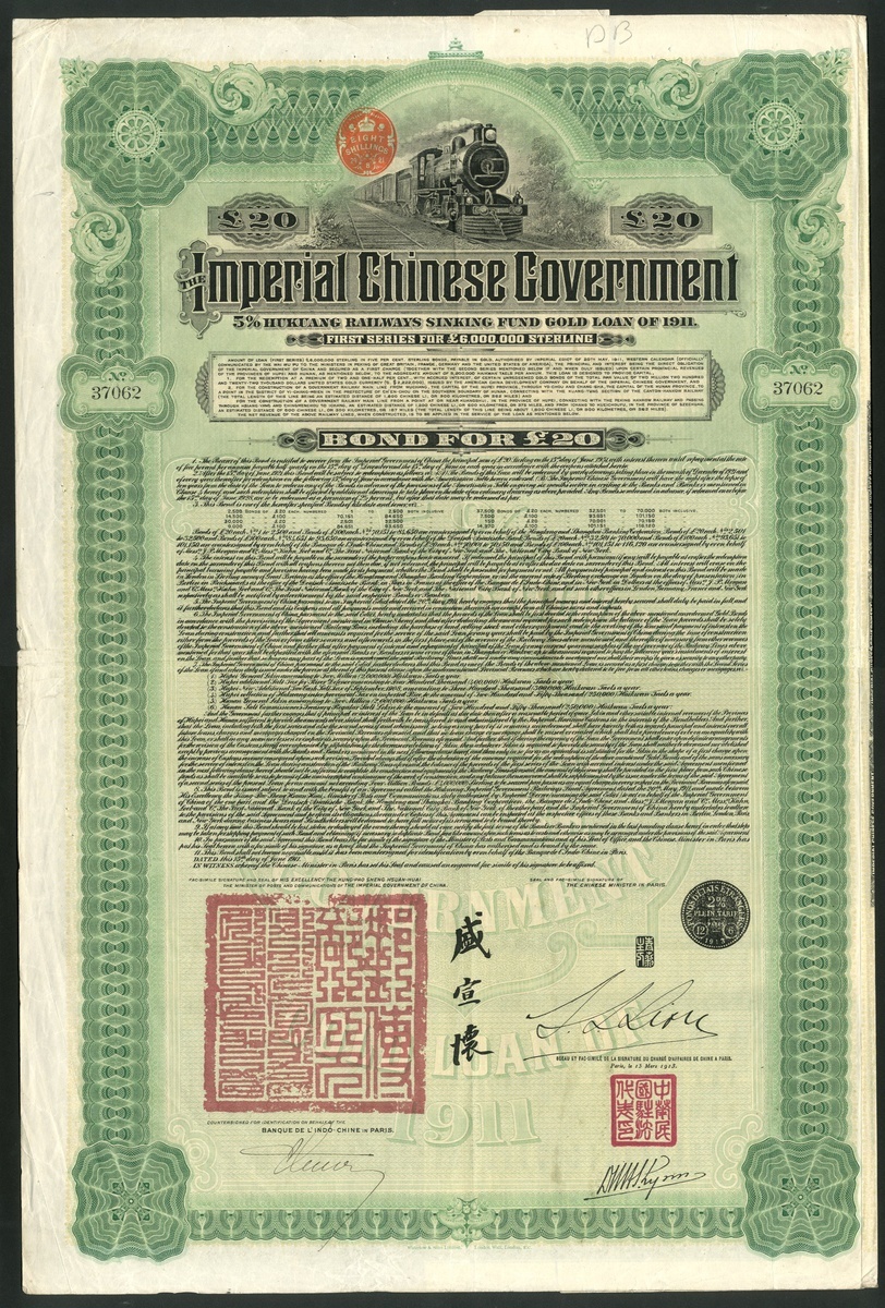 (x) China: 1911, 5% Hukuang Railways 5% Gold Loan, a group of 6 bonds for £20, issued by Banque de L'Indo-Chine, large format, steam train at top, green and black, with coupons, together with Banque Industrielle de Chine, 500 franc share, 1919, capital 75 million francs, yellow & black, with coupons. VF and EF (2).