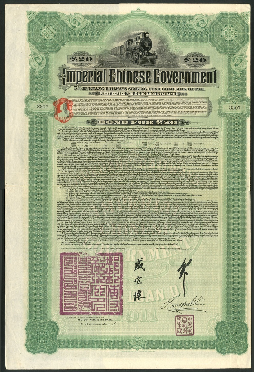 China: 1911, 5% Hukuang Railways 5% Gold Loan, a bond for £20, issued by the Deutsch-Asiatische Bank, #3307, large format, steam train at top, green and black, with coupons. GVF.