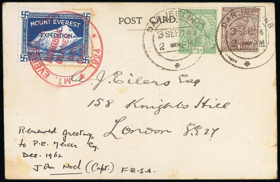 Type D; Rongbuk Glacier: 1924 (3 Sept.) Expedition souvenir card to London bearing India K.G.V ½a. and 1a. tied by Darjeeling c.d.s. with the Expedition label at left tied by the type D postmark in red; signed by John Noel, the designer of the label. Fine. Photo