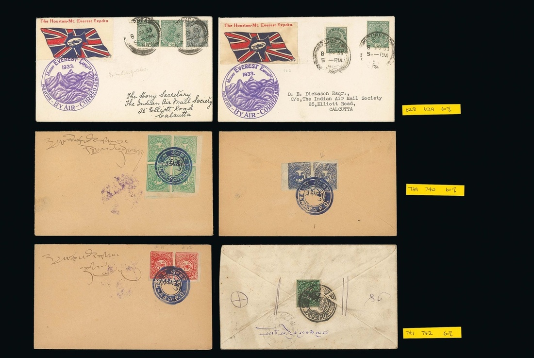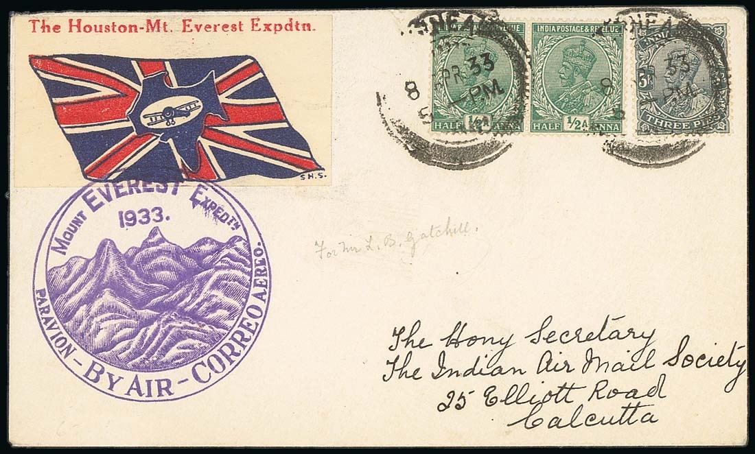 1933 (8 Apr.) envelope to the Indian Air Mail Society bearing India 3p. and ½a. (2) tied by Purnea c.d.s. with The Houston Mt. Everest Expedtn. label tied by a fine strike of the illustrated type XI handstamp in purple. With the subscriber's name written in pencil, the reverse with printed signature of Stephen Smith and part Park Street arrival c.d.s. (10.4). 87 covers were flown. Photo