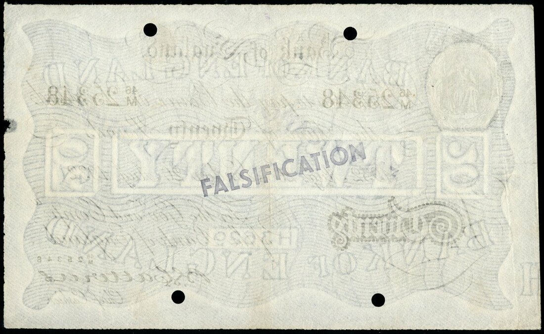Operation Bernhard, B.G.Catterns, Bernhard £20, London, 20 August 1932, serial number 46/M 25348, black and white, ornate crowned vignette of Britannia top left, value in black tablet low left