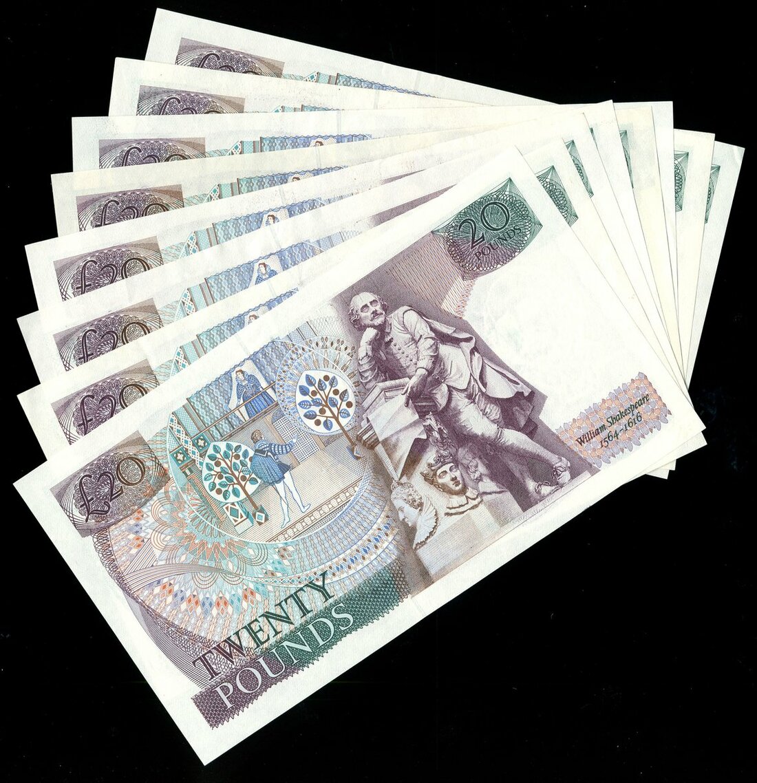 Bank of England, David Henry Fitzroy Somerset (1970-1988), £20 (8), ND (1984), a complete run of serial number suffixes A through K, purple and multicoloured, Elizabeth II at right, Saint George and the dragon at centre, Britannia low left, reverse purple, William Shakespeare and the balcony scene from Romeo and Juliet