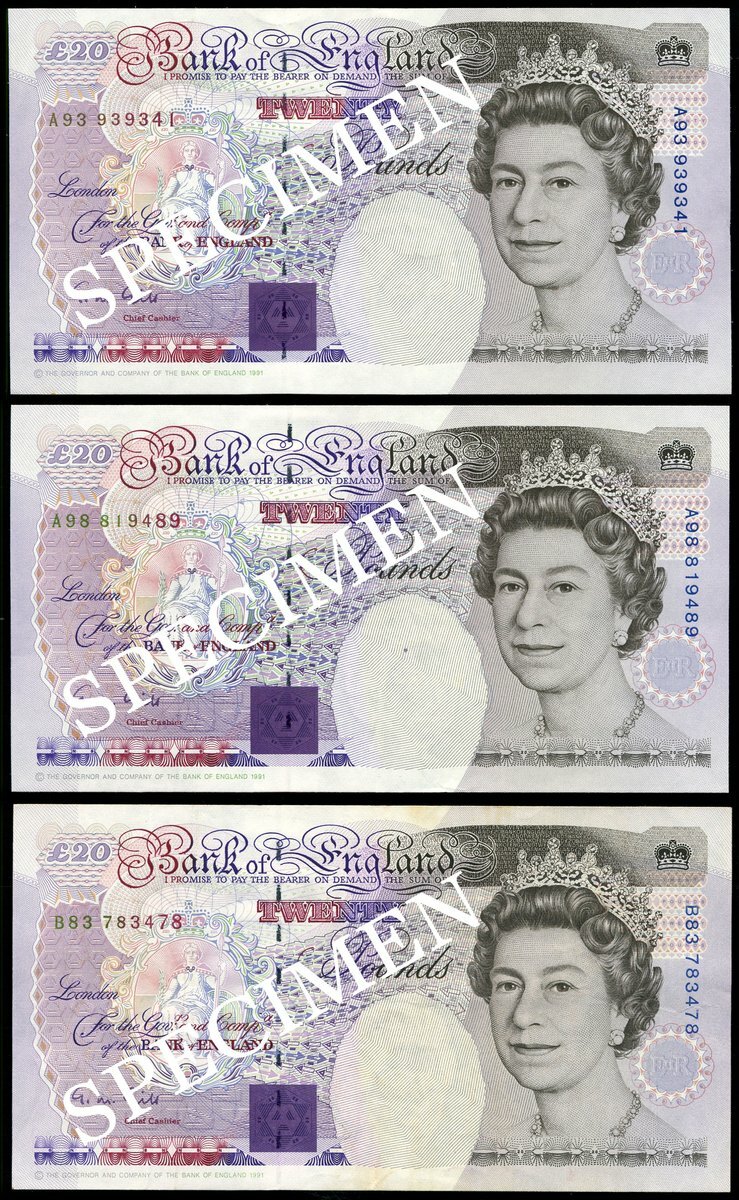 Bank of England, George Malcolm Gill (1988-1991), £20 (3), ND (1991), column sorts, serial number prefixes A93, A98 and B83, purple and multicoloured, Elizabeth II at right, Britannia at left, reverse purple, Michael Faraday and a lecture given by Faraday at the Royal Institution