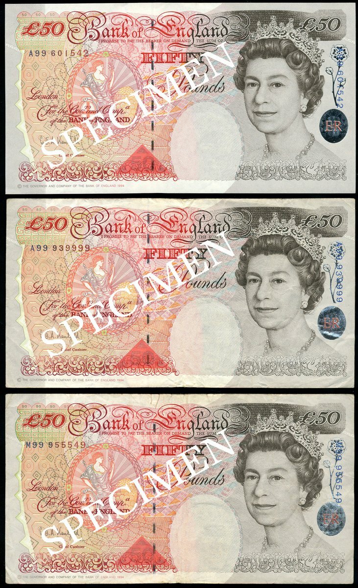 Bank of England, Graham Edward Alfred Kentfield (1991-1998), £50 (3), ND (1994), experimental serial number A99 601542 red and multicoloured, Elizabeth II at right, Britannia at left, reverse red, Sir John Houblon, also another example with serial number A99 939999 and a further example with serial number M99 955549,