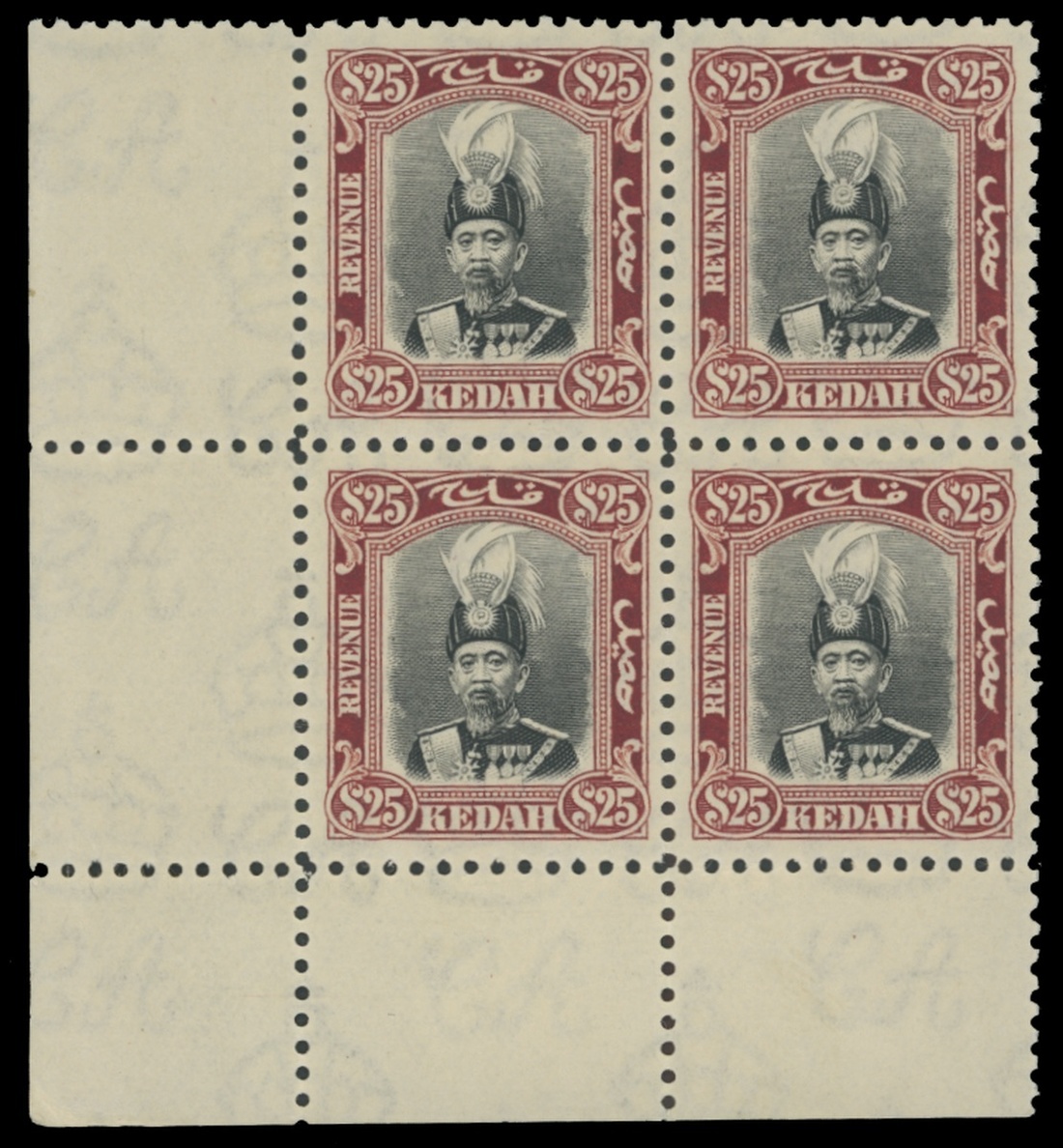 1937 $25 black and maroon lower left corner lock of four, fine unmounted mint. Barefoot 4