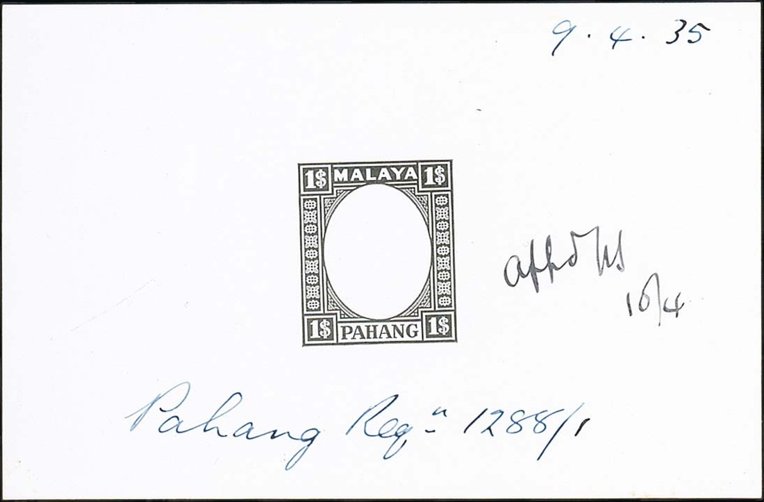 “1$” frame in black on glazed card (92x60mm.), marked “Pahang Reqn 1288/1”, dated “9.4.35”, further marked “Appd”, initialled and dated “10/4”, fine. Photo