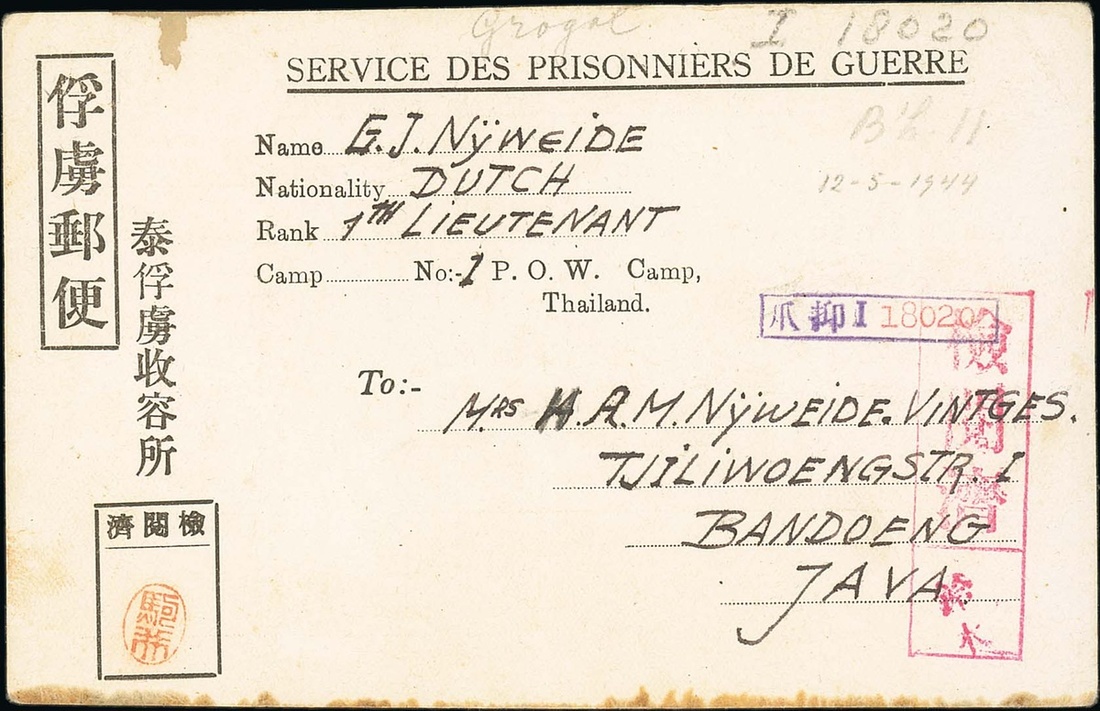 1944 (12 May) card (fourth/fifth type) from a Dutch officer at Camp No. 1 headquartered at Nong Pladuk, addressed to his wife in Java, showing Japanese censor seal of Komai in orange and various markings that his wife was in Grogol Camp. Photo