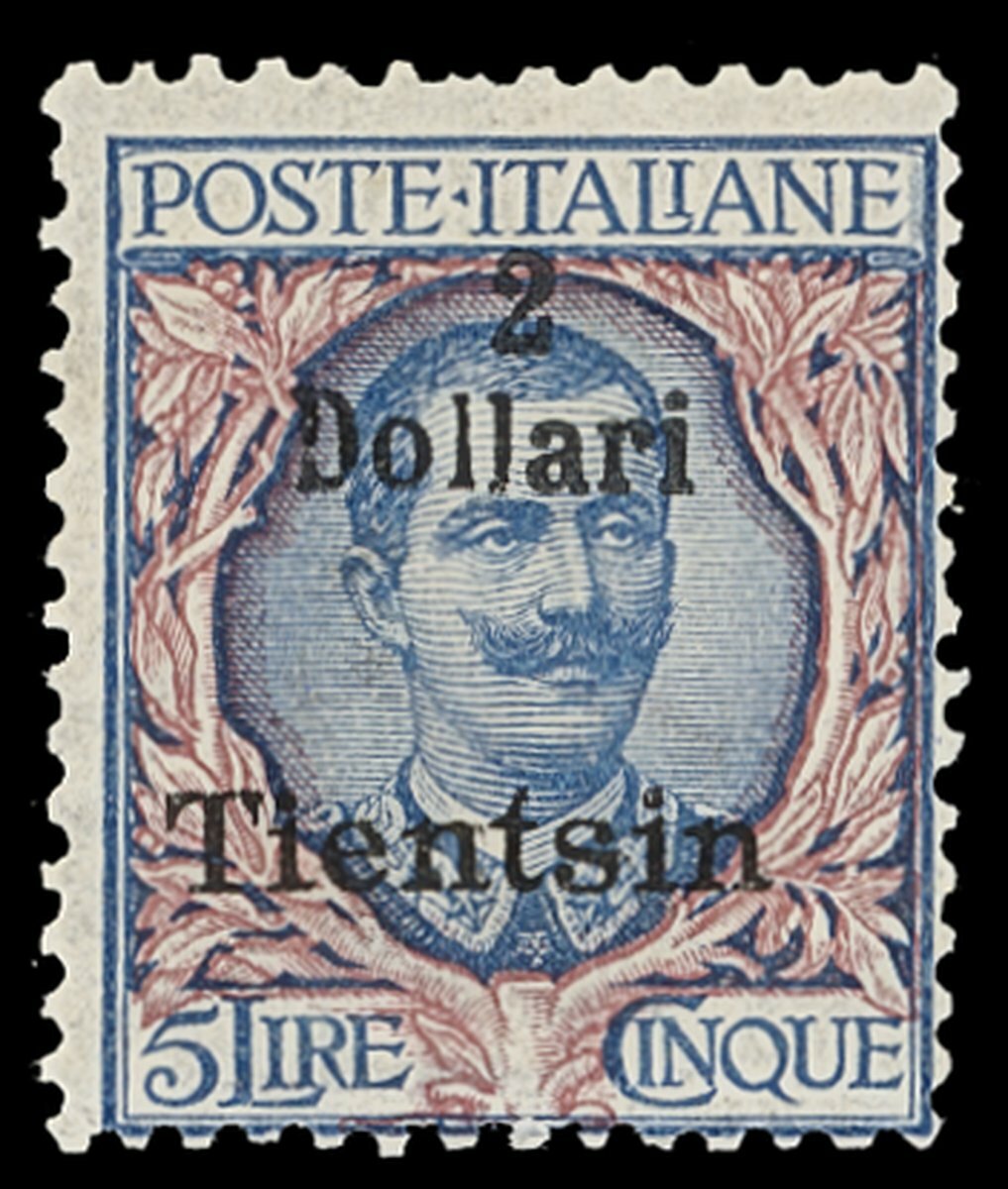 1919-21 “2/Dollari/Tientsin” on 5L. blue and rose, off-centre as are all the known examples, part original toned gum. S.G. 54, £11,000. Sass. 23, €30,000