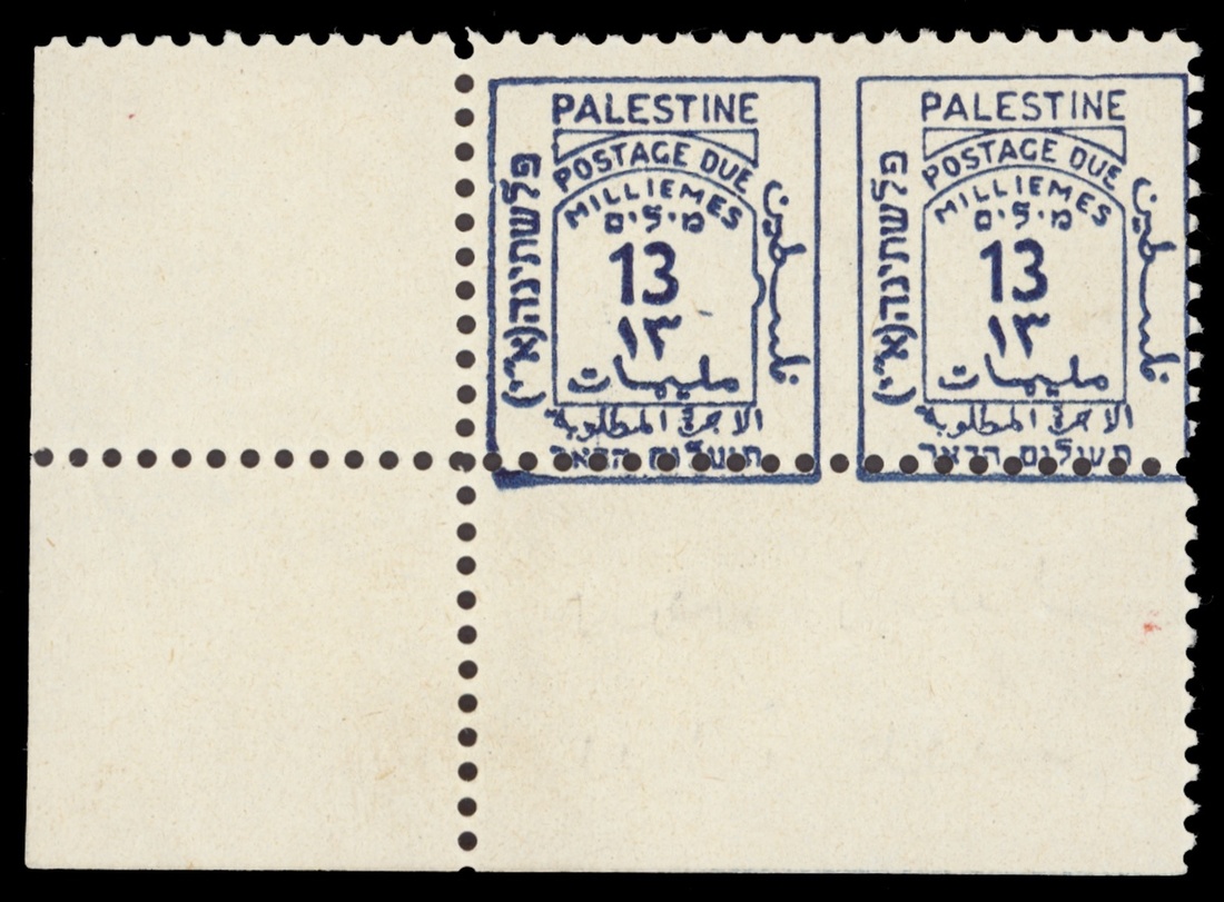1923 13m. steel blue, horizontal pair from the lower left corner of the sheet, variety imperforate between, original gum; centred to foot, fine and rare. S.G. D5a, £1,100