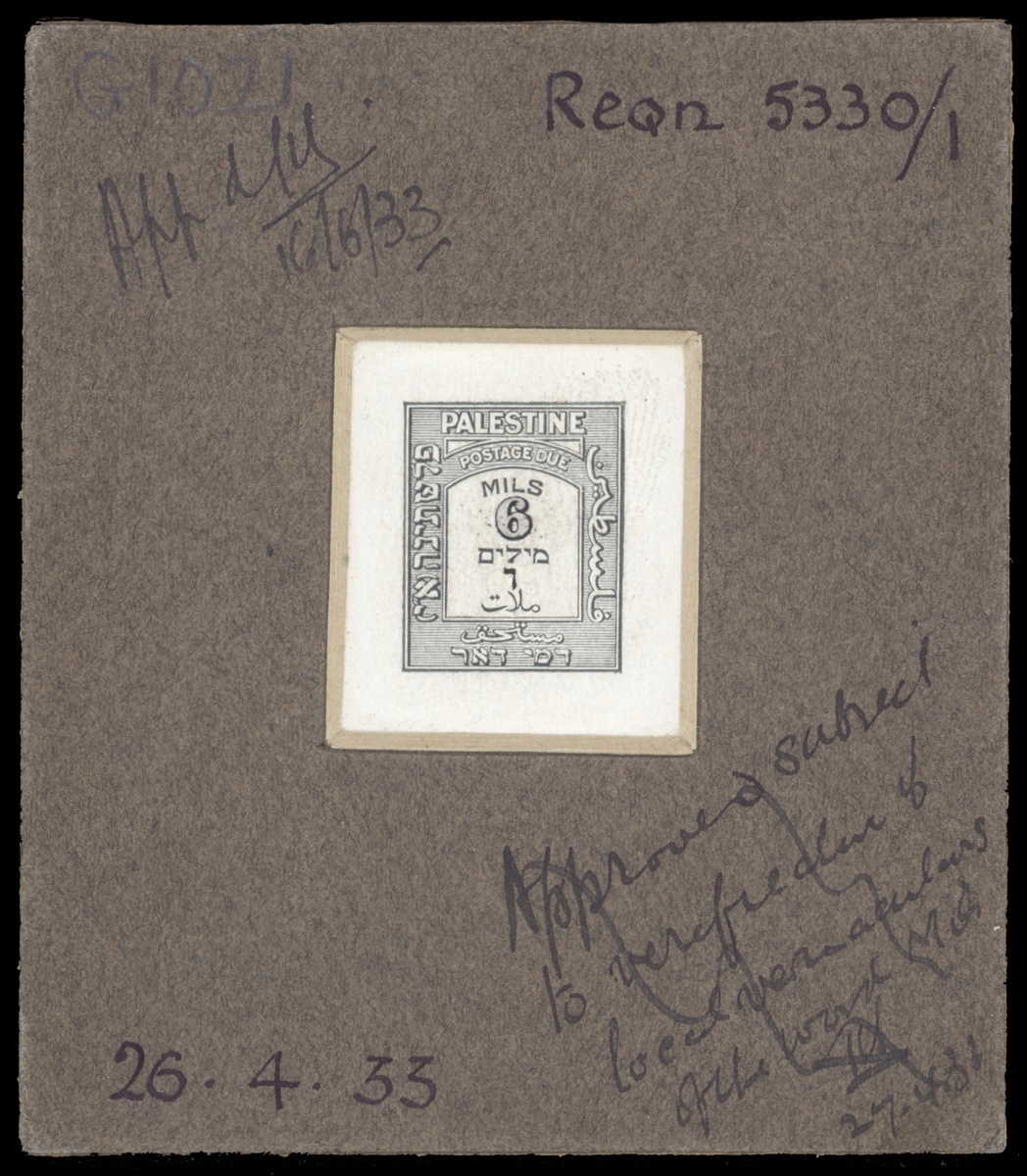 1928-45 6m. die proof in black with the value handpainted in Chinese white, mounted on card, a variety of notations on the surrounding card and the oval Thos. De La Rue handstamp on the reverse. Fine