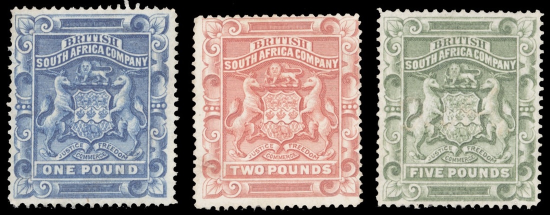 1892-93 £1, £2 and £5, each with part original gum; a few trimmed perfs in places. S.G. 10-12, £2,400+
