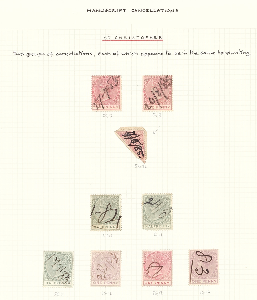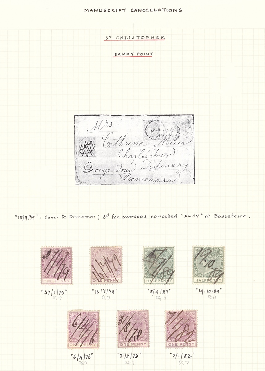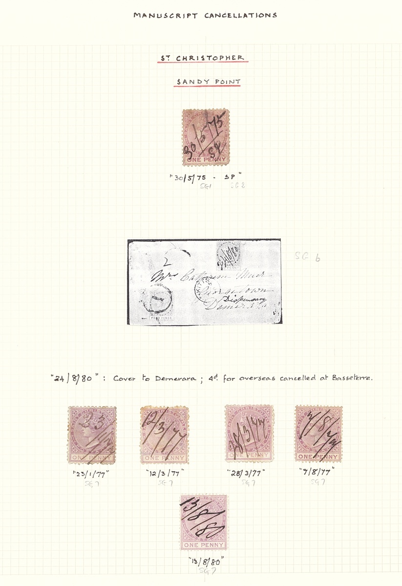 1870-86 collection of stamps with manuscript cancellations (40) including bisects and surcharges, some cancelled at Sandy Point, Basseterre etc. An interesting group for the specialist