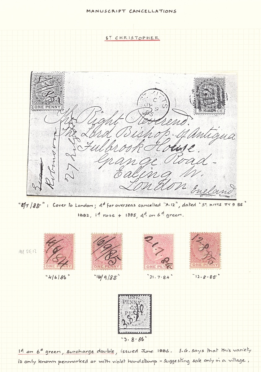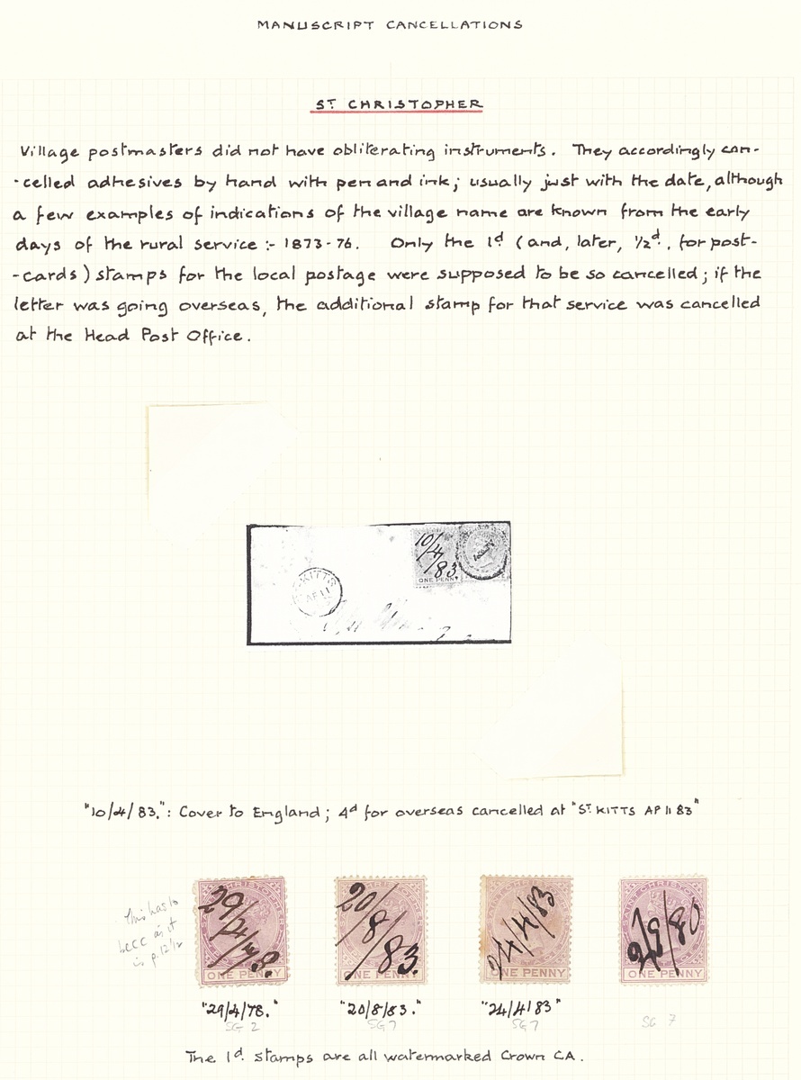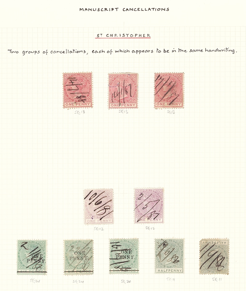 1870-86 collection of stamps with manuscript cancellations (40) including bisects and surcharges, some cancelled at Sandy Point, Basseterre etc. An interesting group for the specialist