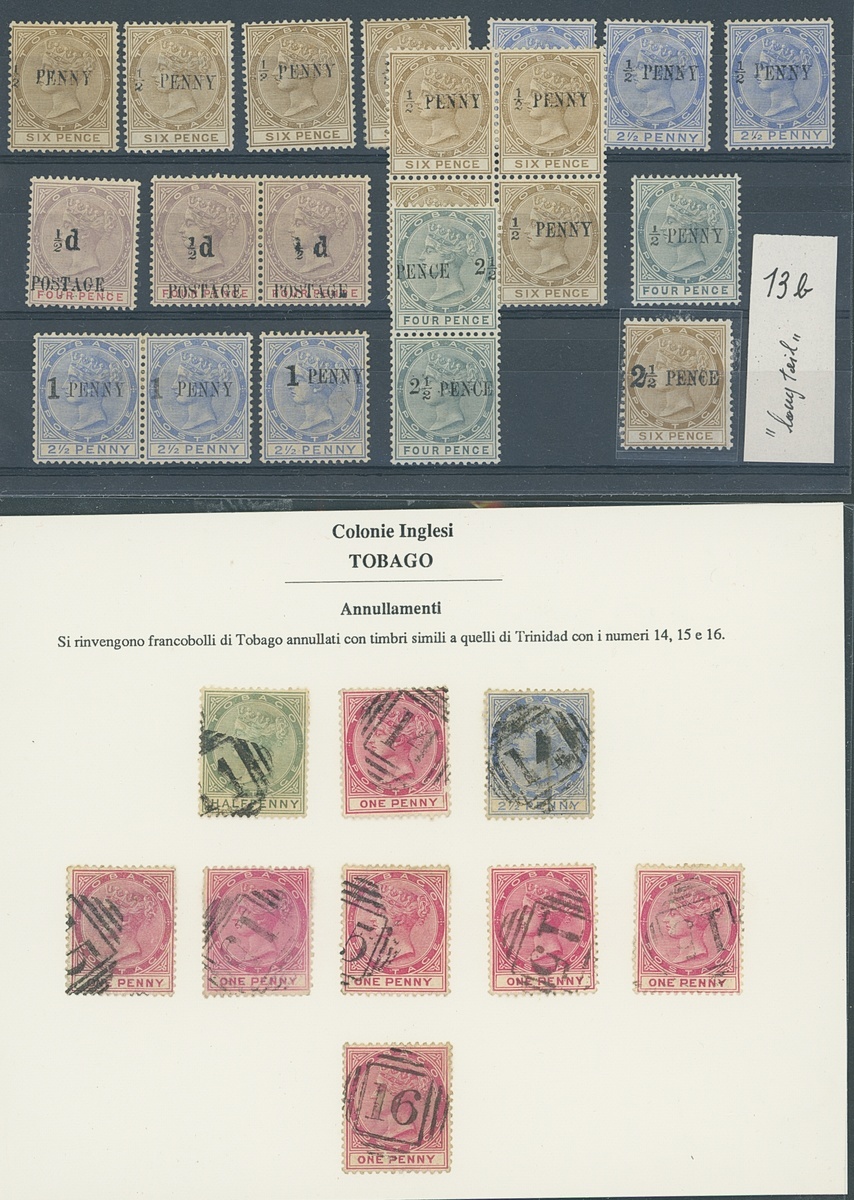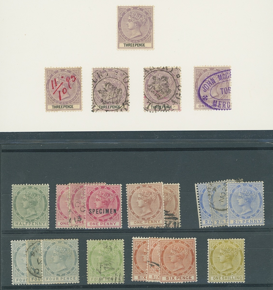 1885-96 mint and used selection on stockcards including 1885-96 with values to 1/- mint and to 6d. used along with a number of ½d. and 1d. values cancelled with numerals 14, 15 and 16, 1886-89 surcharges with ½d. on 2½d. blue mint (3), ½d. on 6d. stone block of four and four other unused examples, 1d. on 2½d. dull blue mint (3, including a pair), 1891-92 surcharges with ½d. on 4d. grey mint, 2½d. on 4d. grey vertical mint pair, 1896 ½d. on 4d. lilac and carmine mint (3, including a pair one with variety space between '½d.' and 'd', a group of Fiscal stamps (5) including 3d. mint and used (3) and £1 used etc. chiefly good to fine. S.G. 20-33 group