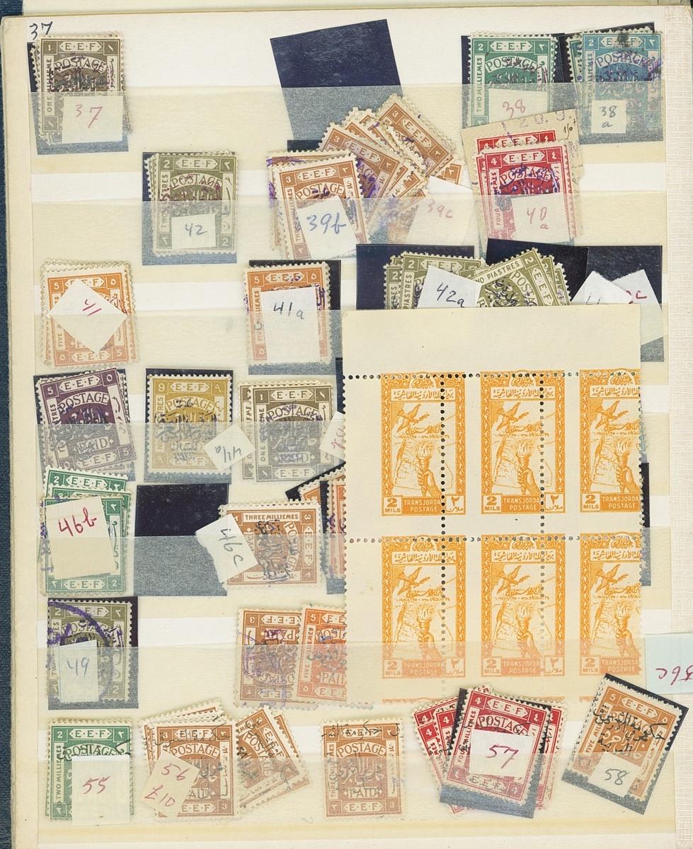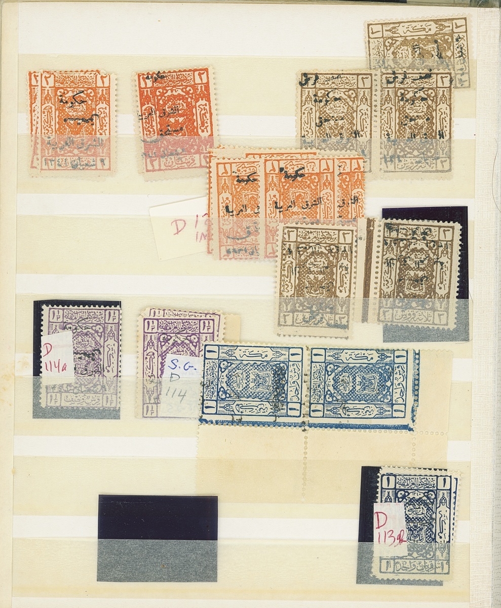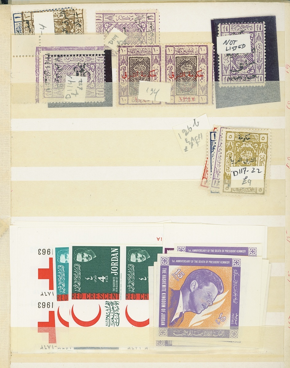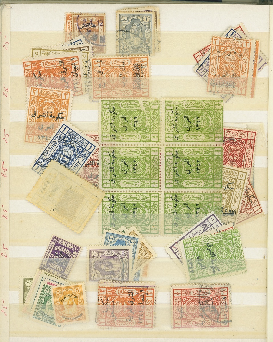 A duplicated mint and used selection in a stockbook, including 1920 "East of Jordan" 1m. perf. 15x14 overprint inverted (2), 1m. perf. 14 overprint inverted (5), 1922 Amman surcharges with better values to 20p .on 20p. perf. 14, 1922 "Arab Government of the East" with 9p. violet overprint, 3m. perf. 14, 1923 "Arab Government of the East" 5p. perf. 15x14 (9, one with Gold overprint inverted), perf. 14 9p. (5), 10p. (8), 20p. (6), 1923 handstamped surcharges, 1923 overprints on Saudi Arabia, 1924 Independence with values to 20p., later issues, Postage Dues, etc., mixed condition and almost certainly containing some forgeries, nevertheless a fascinating and valuable lot which will reward careful viewing and sorting