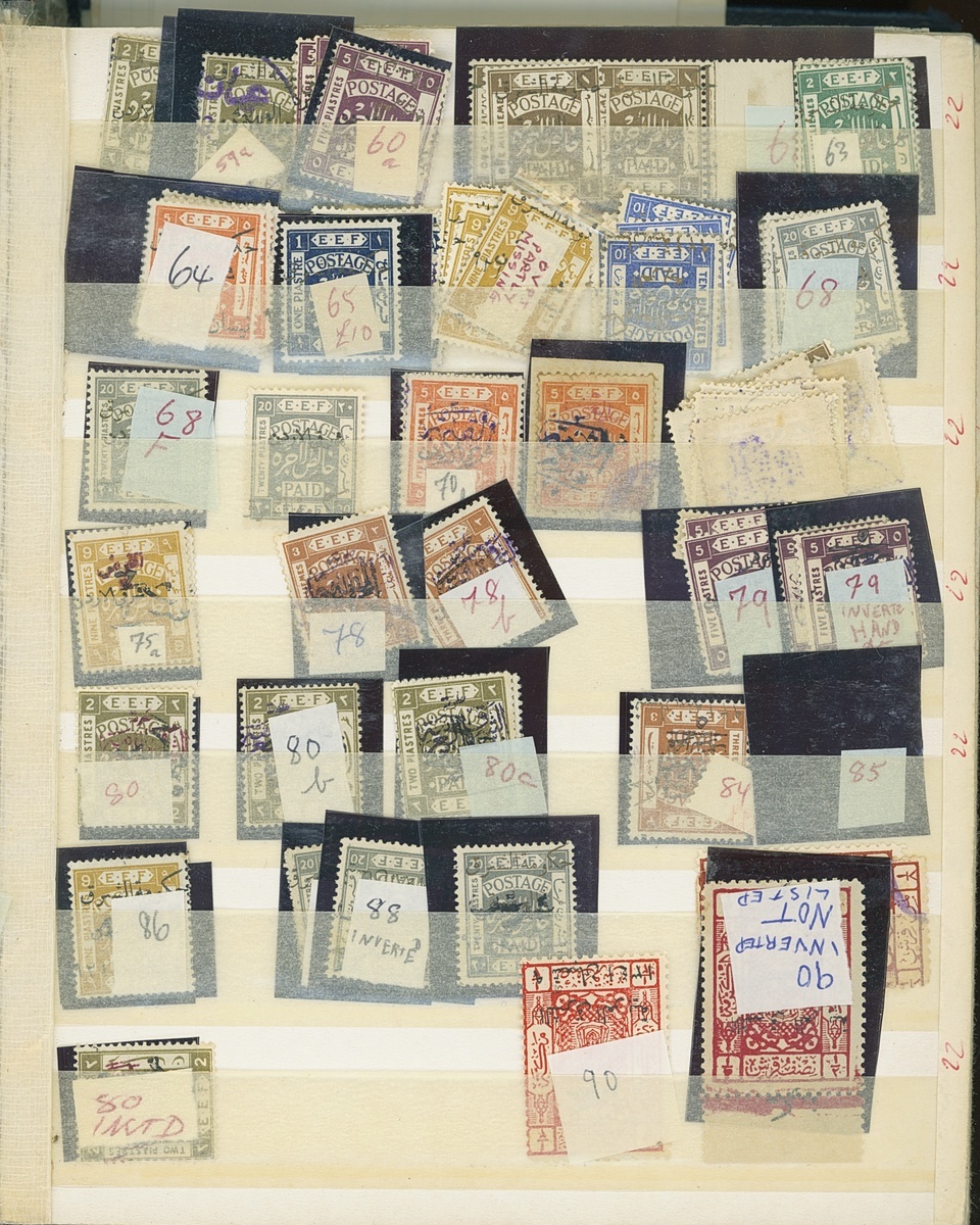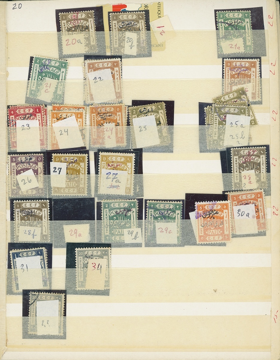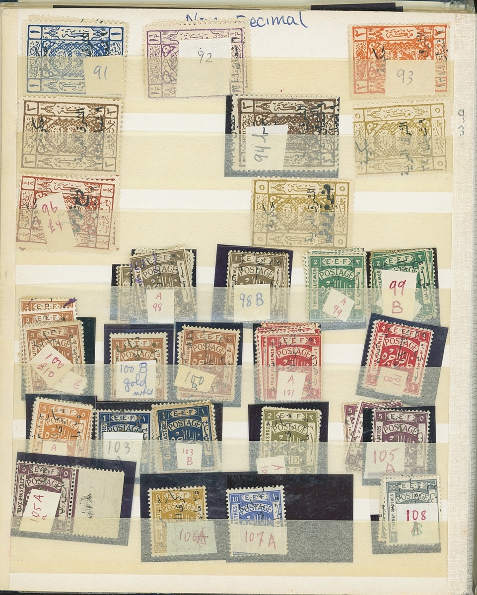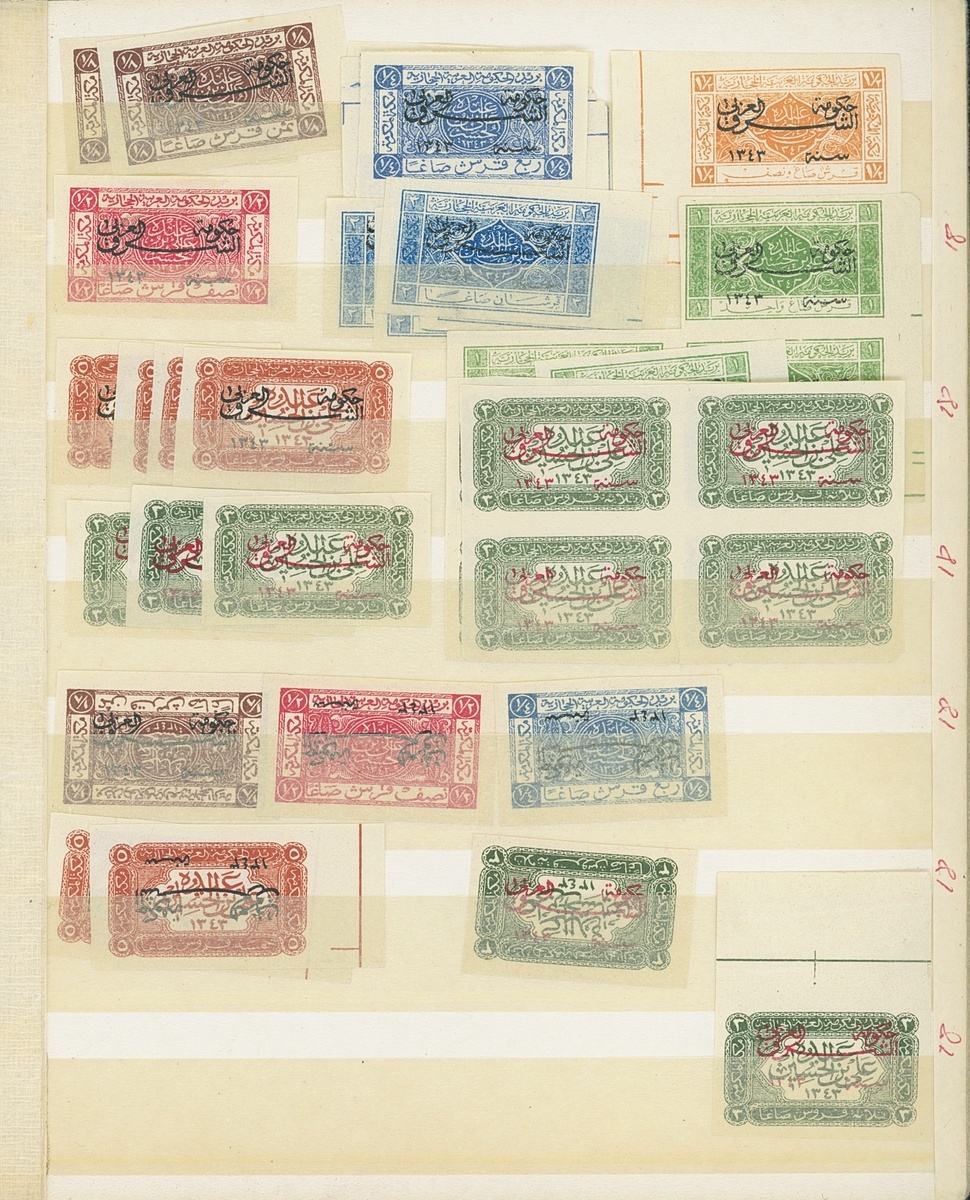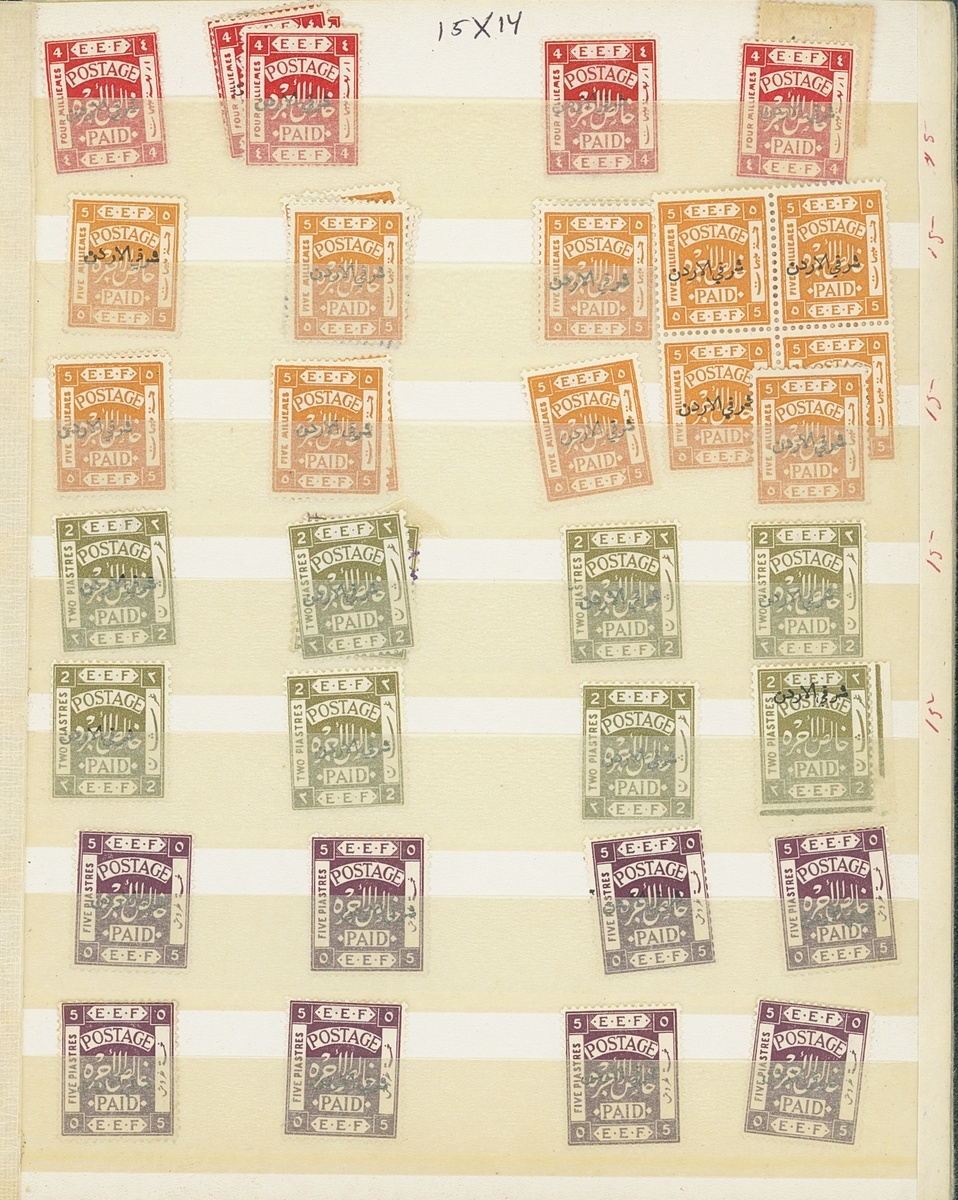 A duplicated mint and used selection in a stockbook, including 1920 "East of Jordan" 1m. perf. 15x14 overprint inverted (2), 1m. perf. 14 overprint inverted (5), 1922 Amman surcharges with better values to 20p .on 20p. perf. 14, 1922 "Arab Government of the East" with 9p. violet overprint, 3m. perf. 14, 1923 "Arab Government of the East" 5p. perf. 15x14 (9, one with Gold overprint inverted), perf. 14 9p. (5), 10p. (8), 20p. (6), 1923 handstamped surcharges, 1923 overprints on Saudi Arabia, 1924 Independence with values to 20p., later issues, Postage Dues, etc., mixed condition and almost certainly containing some forgeries, nevertheless a fascinating and valuable lot which will reward careful viewing and sorting