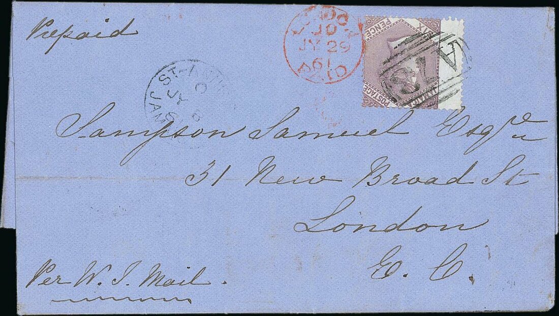 1861 (8 July) entire letter from St. Ann's Bay "Per W.I. Mail" to London, bearing wing-margin 6d. dull lilac cancelled "A73" and additionally tied by London Paid datestamp (29.7) alongside, part despatch datestamp at left, Kingston transit datestamp (9.7) on reverse. Photo