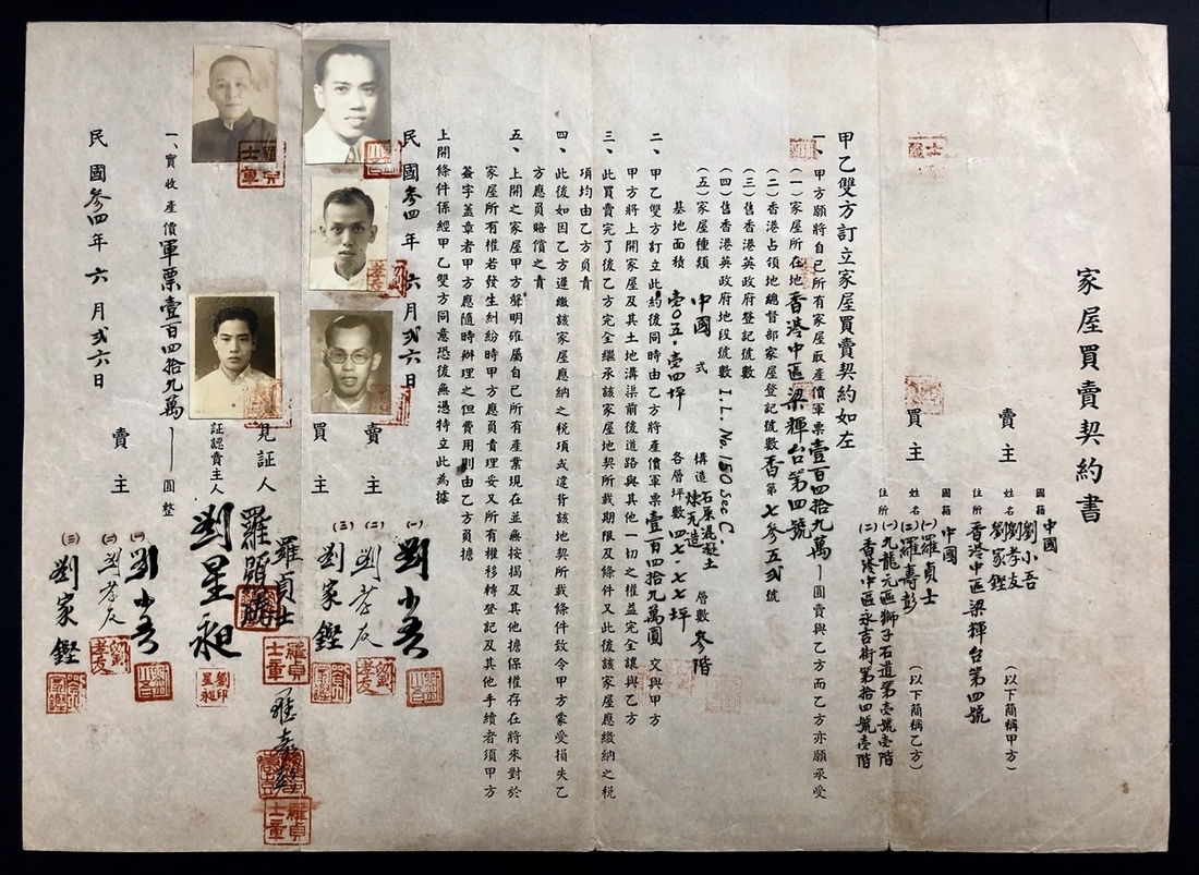 Hong Kong and Macao Japanese Occupation of Hong Kong: 1945 (26 Jun.) an agreement for sale and purchase of a property located at 4 Leung Fai Terrace, Mid-level West, Hong Kong, which involving three sellers and two buyers, with their photo and signature seal on the agreement, value of consideration is Japanese Military Yen 1,490,000.00 together with 1944 100y. "Mount Fuji" revenue stamp issued by Government Headquarter of the Hong Kong Occupied Region in complete sheet of fifty on page, showing the signature seals of the buyers and sellers. On 1 June 1943 the yen became the only legal tender in Hong Kong, after the surrender of Imperial Japan was announced by Japanese Emperor Hirohito on August 15 and formally signed on 2 September 1945, the Japanese Ministry of Finance announced that all military yen become void on 6 September 1945.
