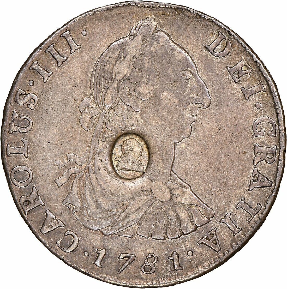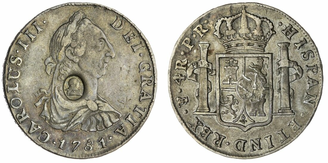 The Hardcastle Collection | EXTREMELY FINE 40 [Top Pop] | George III, Emergency Issues, Countermark Half-Dollar, oval counterstamp on Charles III 4-Réales, 1781-PR, Potosi (ESC 1880 [611] R2; S.3767), the host coin near very fine, the countermark good very fine, rare, in NGC holder, graded XF40 ~ C/S UNC Strong (Cert. #5878623-001) [*Single Finest*]
