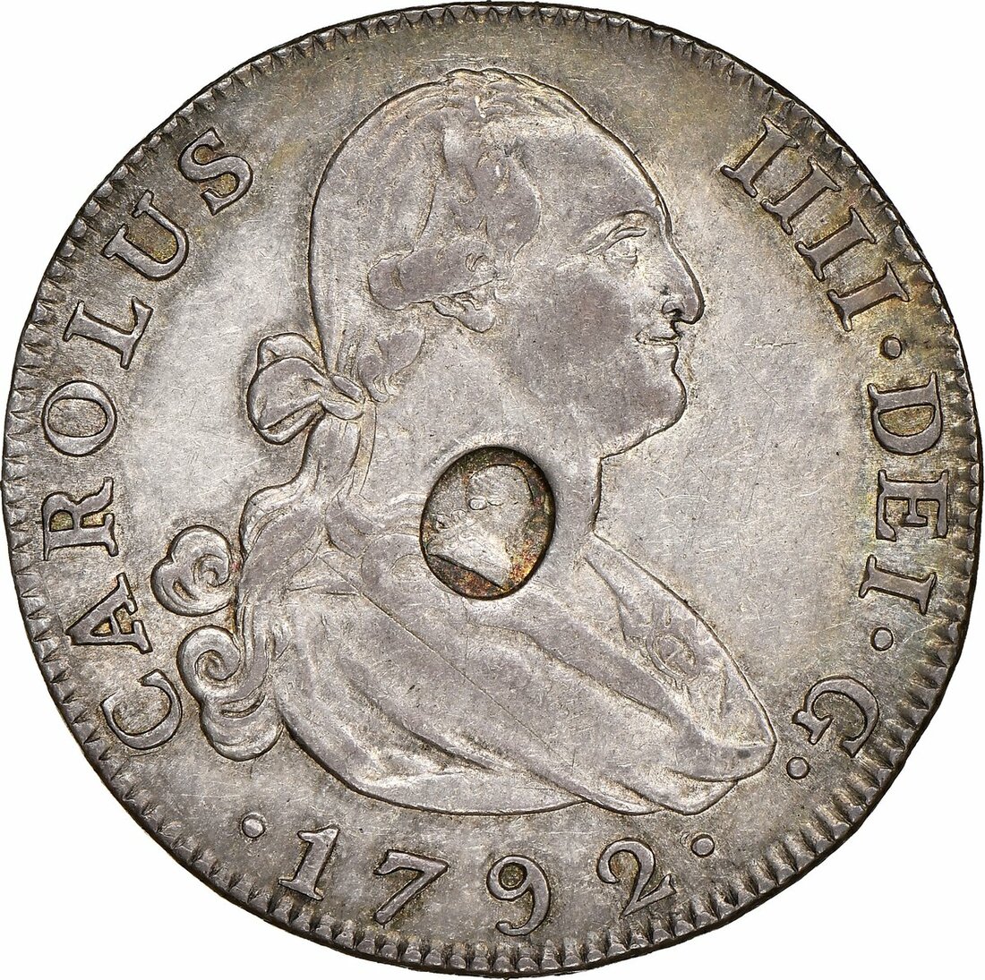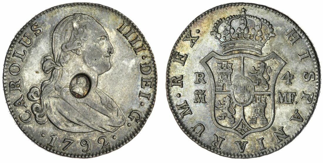 The Hardcastle Collection | ALMOST UNCIRCULATED 53 | George III, Emergency Issues, Countermark Half-Dollar, oval counterstamp on Charles IV 4-Réales, 1792-MF, Madrid (ESC 1875 [611]; S.3767), host coin very fine, countermark good very fine with a pleasing tone, in NGC holder, graded AU53 - C/S UNC Std (Cert. #5878623-002) [Tied 1 of 4 / 7 Finer]