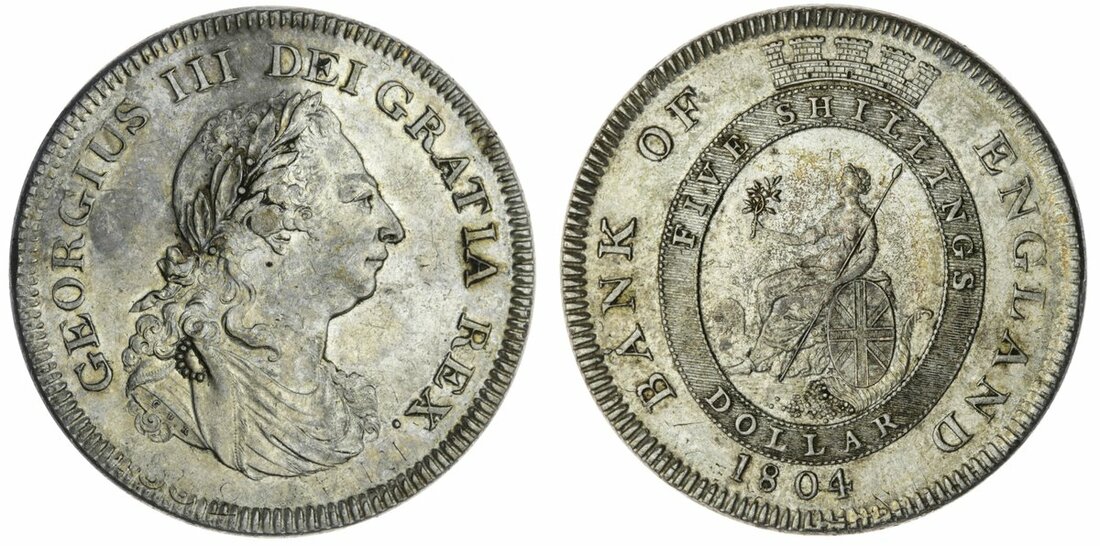The Hardcastle Collection | George III, Bank of England, Dollar (of 5-Shillings), 1804, struck over an 8-Reales, 1802 Mexico City, top leaf to centre of E in DEI, laureate, draped and cuirassed bust right, : C. H. K on truncation, rev. Britannia seated left, K in relief to left of shield (Bull C/2; ESC 1931 [149]; Davis 10; S.3768), details of host coin clearly visible including original date, light tone, a bold very fine