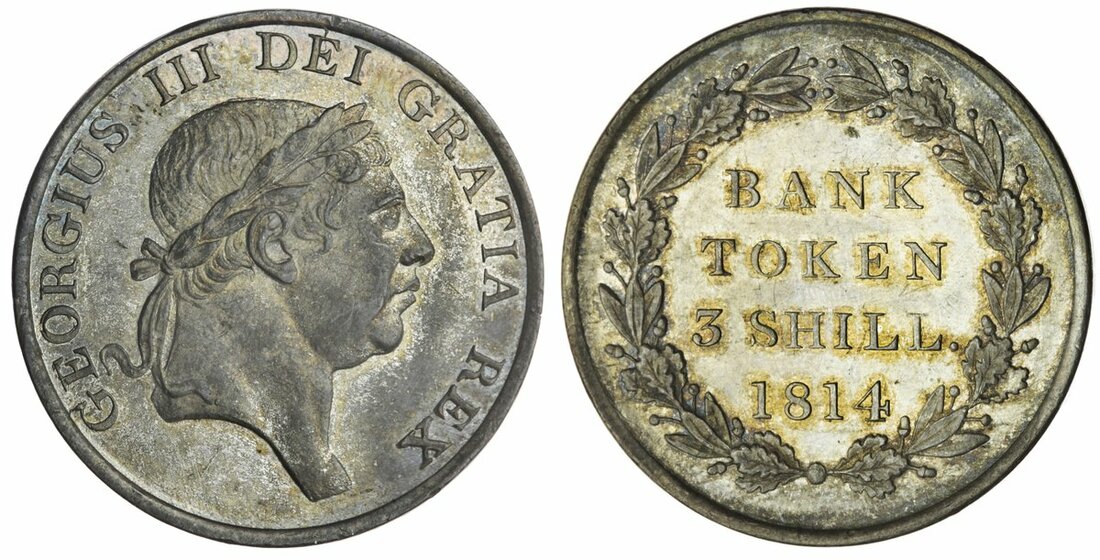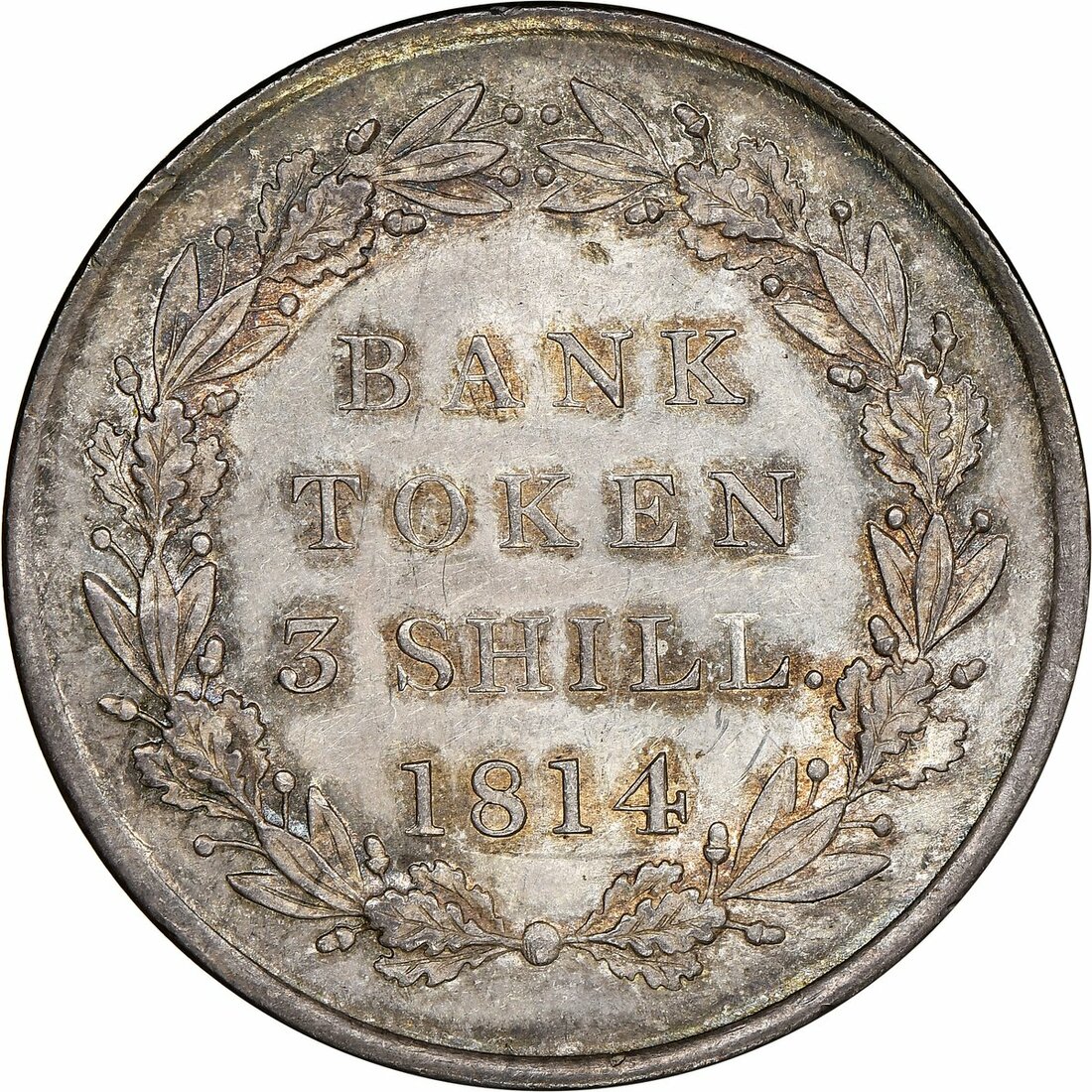 The Hardcastle Collection | MINT STATE 61 | George III, Bank of England, Three-Shillings, 1814, second laureate head, rev. open wreath, 16 acorns and 16 berries (Bull B²/3; ESC 2083 [422]; Davis 58; S.3770), smoky tone on obverse, reverse with golden toning in recesses, a pleasing extremely fine, in NGC holder, graded MS61 (Cert. #5878622-008) [Tied 1 of 6 / 10 Finer]